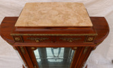 Fanerat i mahogny. Med beslag i mässing. Ovanpåliggande skiva i marmor. Med tre dörrar. Invändigt två hyllor av glas.