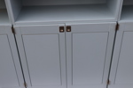 Blålackade. Med förnicklade handtag. Med dörrar, hyllor och lådor.