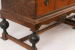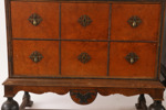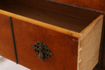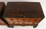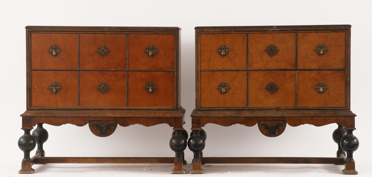 Bonad björk och rot. Två lådor vardera. Kopplade, klotformade ben. Beslag i mässing. En med nyckel.