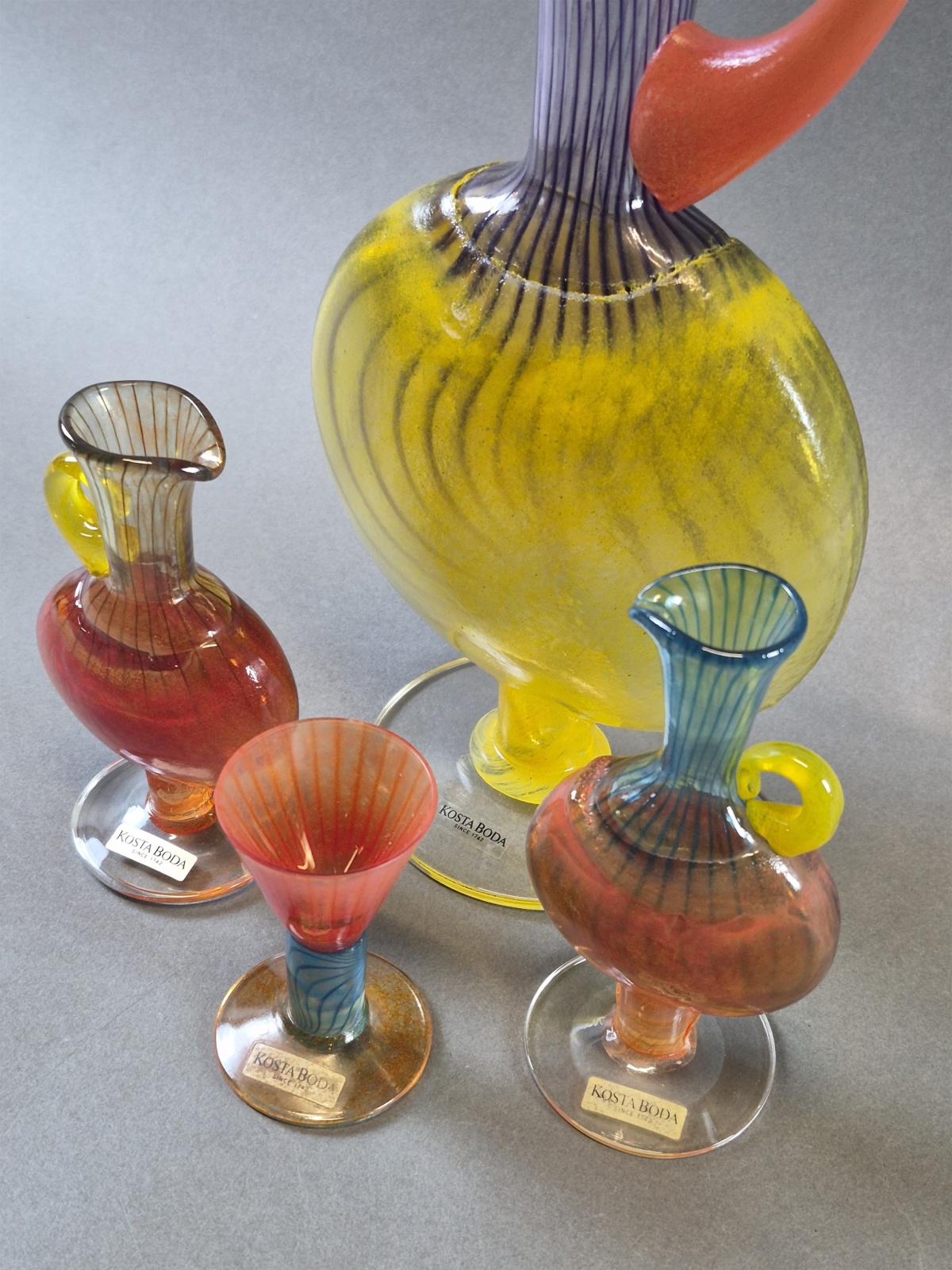 Kannor och snapsglas Kjell Engman 4 delar, Kosta Boda, glas, högsta höjd 28 cm