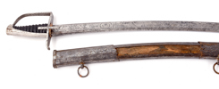 Late 18th century, hilt in iron, back of blade with text F F Runkel Sohlingen, etched decorations, scabbard, 104,5 cm, blade 91 cm; rust damages, scabbard mounts with holes, grip leather later, damages