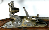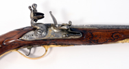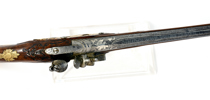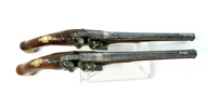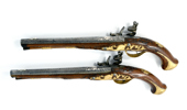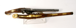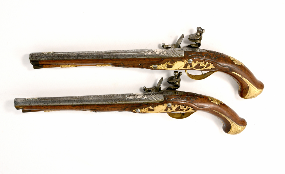 sent 1700-tal, flintlås, lås med CA under krona i guld, damaskerade pipor märkta i silver CHRISTIAN AUGUST H Z S H S, förgyllda mässingsbeslag, 44,5 cm, pistolerna troligen tillverkade i Carlsbad, Böhmen; en kolv med lagning, smärre stocklagningar, Proveniens: Augustenborgs rustkammare. Carl August, ursprungligen Fredrik Christian August av Augustenborg , född 9 Juli 1768 på Augustenborgs slott i Danmark, död 28 Maj på Kvidinge Hed, Skåne Ståthållare i Norge 1807-10. Svensk kronprins 1809-10
