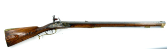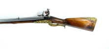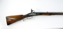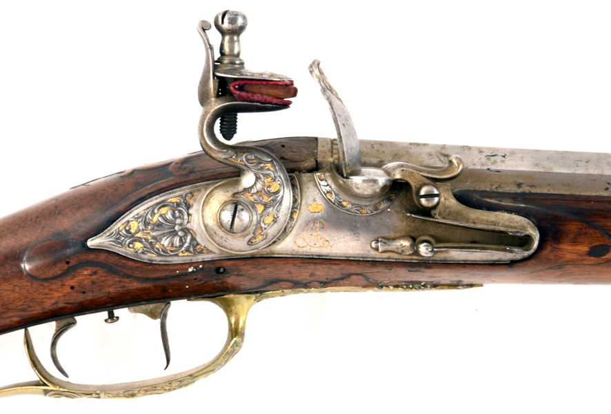 sent 1700-tal, flintlås, lås med stålskuren och förgylld dekor, CA under krona, mässingsbeslag, troligen tillverkad i Carlsbad, Böhmen, 118 cm, cal ca 15 mm; kolvlådslock och laddstake senare, kolv med Or-skador, mindre del på sidbleck saknas. Proveniens: Augustenborgs rustkammare. Carl August, ursprungligen Fredrik Christian August av Augustenborg , född 9 Juli 1768 på Augustenborgs slott i Danmark, död 28 Maj på Kvidinge Hed, Skåne Ståthållare i Norge 1807-10. Svensk kronprins 1809-10
