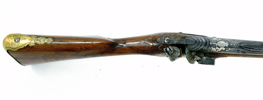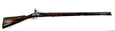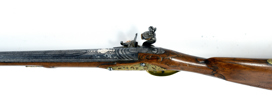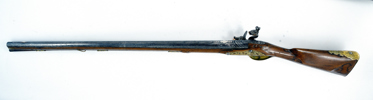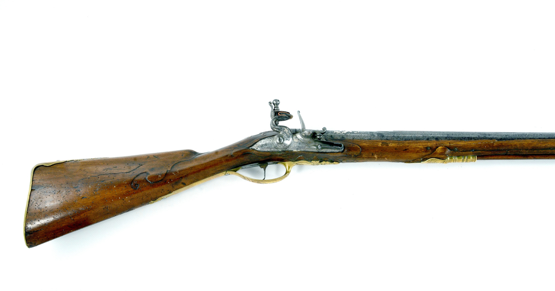 sent 1700-tal, flintlÄs, lÄs med silverdekor CA under krona, damaskerad rÀfflad pipa med silverdekor CA under krona, mÀssingsbeslag, troligen tillverkat i Carlsbad, Böhmen, 125 cm, kaliber ca 17 mm, kolv med Or-skador, smÀrre stockskador och lagningar . Proveniens: Augustenborgs rustkammare. Carl August, ursprungligen Fredrik Christian August av Augustenborg , född 9 Juli 1768 pÄ Augustenborgs slott i Danmark, död 28 Maj pÄ Kvidinge Hed, SkÄne StÄthÄllare i Norge 1807-10. Svensk kronprins 1809-10