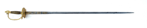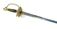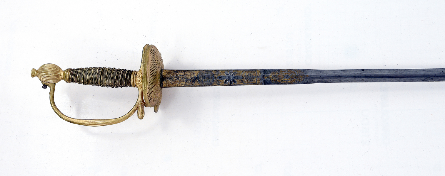 Svensk, ca 1800, förgyllt fäste, klinga 1700-talets mitt med etsad och förgylld dekor samt text, 91 cm, klinga 75,5 cm