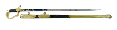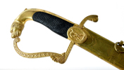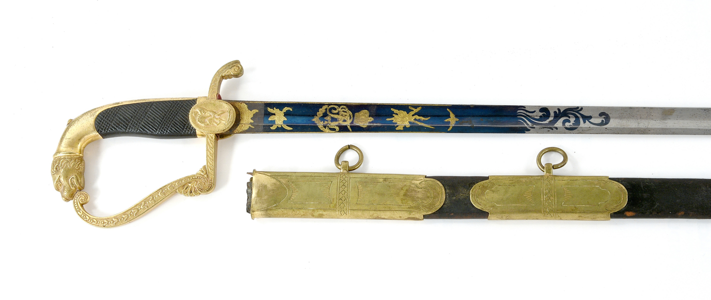 Förgyllt mässingsfäste, klinga med etsad, förgylld och blånerad dekor, Fredrik VI monogram (1808-39) etc, balja, 91 cm, klinga 78,5 cm; blade with rust spots