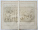 "SACRIFICE." This engraving illustrates a scene of ritual sacrifice based on the reliefs from the Column of Trajan, featuring a group of figures in classical attire and oxen gathered around an altar with standard-bearers in the background. The technical nature is a copper engraving. It was published in the monumental series L’antiquité expliquée et représentée en figures, printed in Paris by Florentin Delaulne. This work is significant for its role in the early development of archeology, providing a systematic visual encyclopedia of the customs, rituals, and daily life of the ancient Greeks and Romans through a rigorous study of surviving classical monuments.
