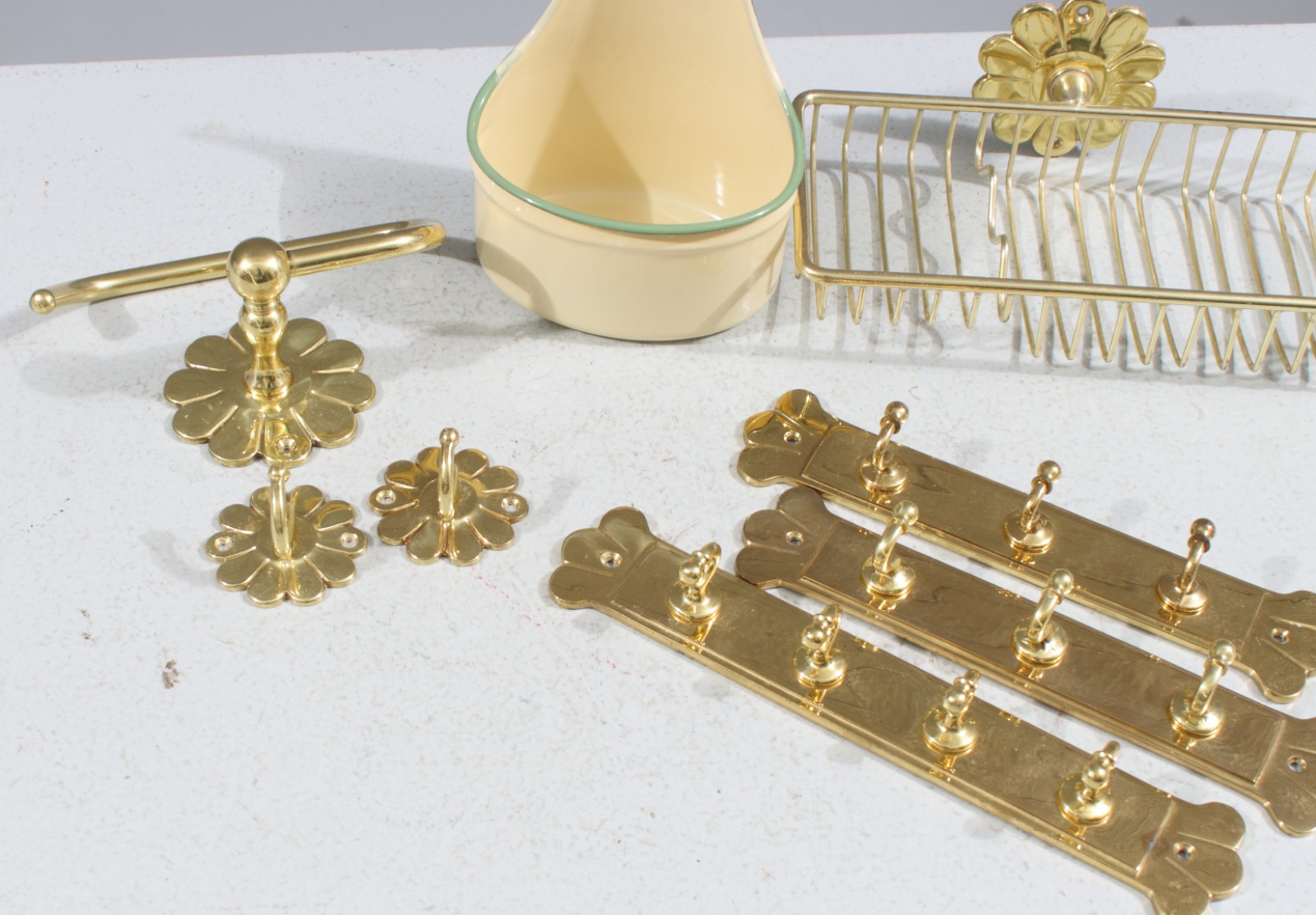 7 delar, mässing, 3st handdukskrokar längd 22,5-25,5 cm, 1st toalettpappershållare, 1st schampo och tvålhållare samt 2st krokar, 1st Kockums vägghängd behållare i emaljerad plåt medföljer. (vån3)