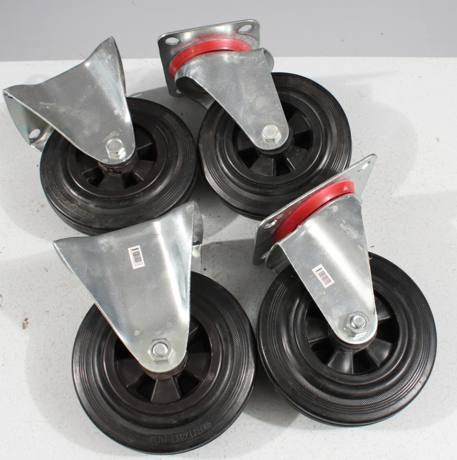 4 stycken, järn och gummi, 2st vridbara, oanvända i nyskick, höjd 19,5 cm, diameter hjul 16 cm. (vån3)