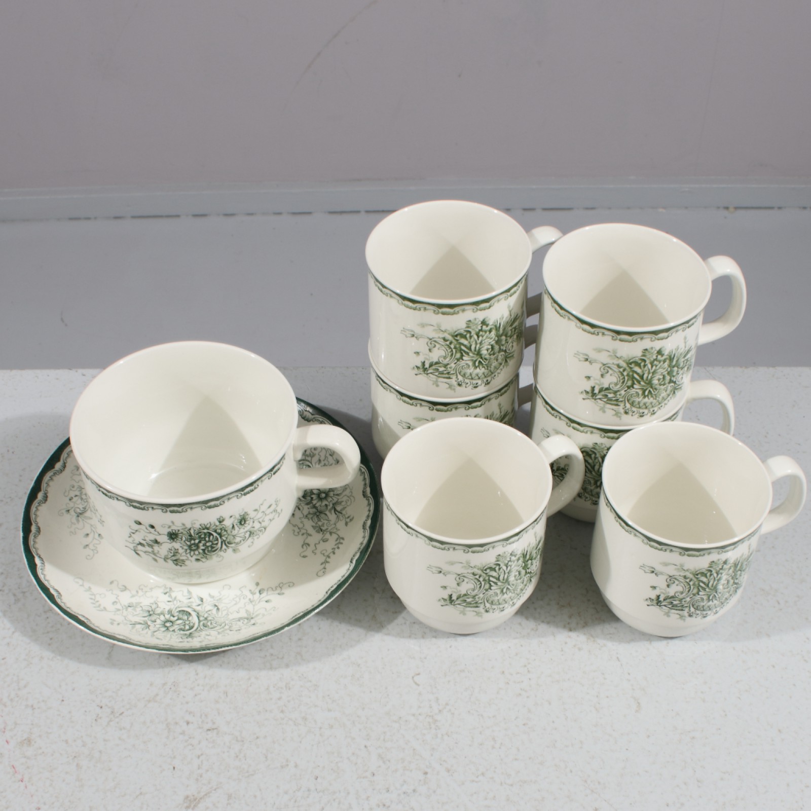 8 delar, 6st muggar, 1st jumbokopp samt 1st jumbofat, mugg höjd 8,8 cm, höjd jumbokopp 8,5 cm, diameter jumbofat 19 cm. (vån3)