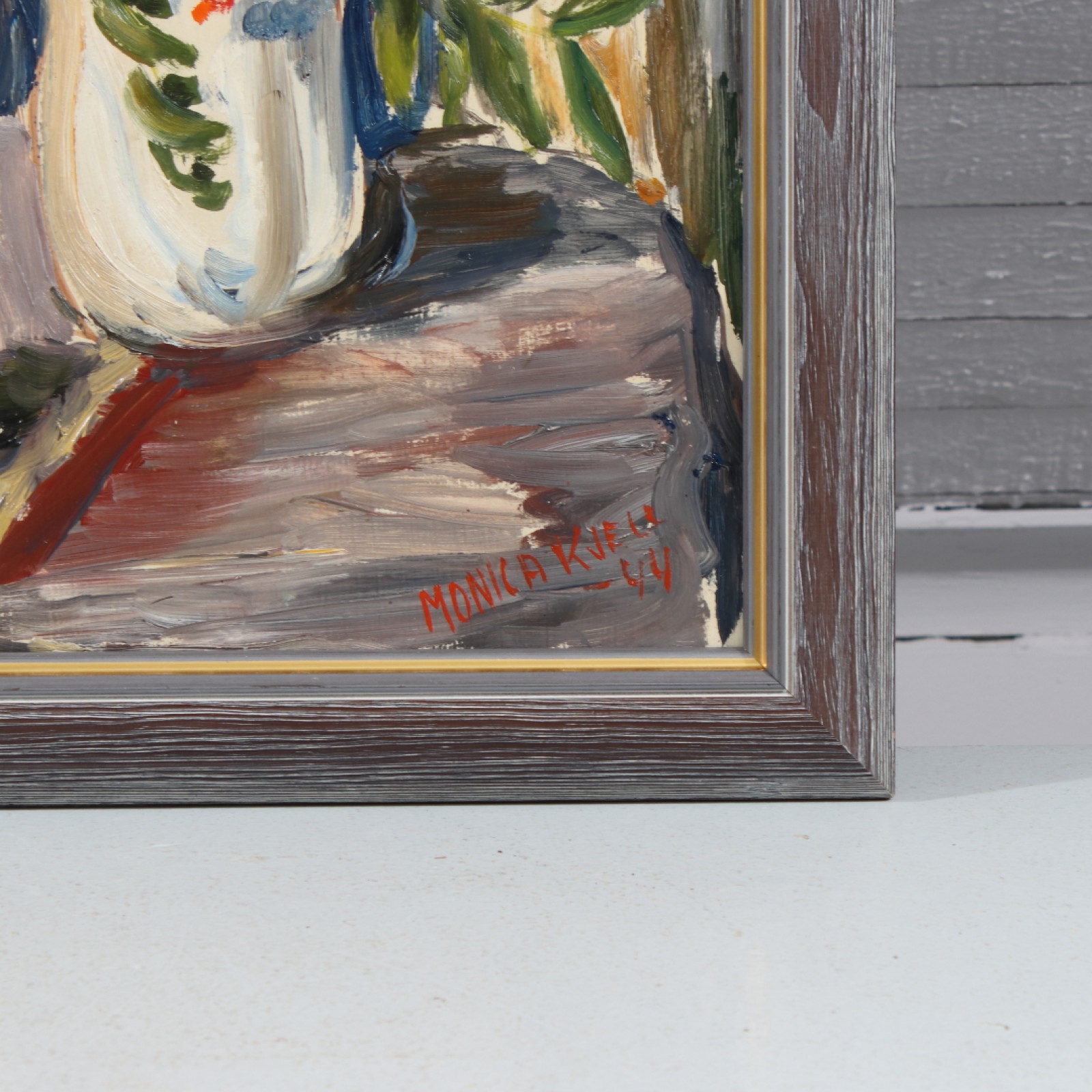 Olja på pannå, "Stilleben", signerad Monica Kjell samt daterad -44, ram 65x57 cm, bild 55,5x47,5 cm. (vån3)