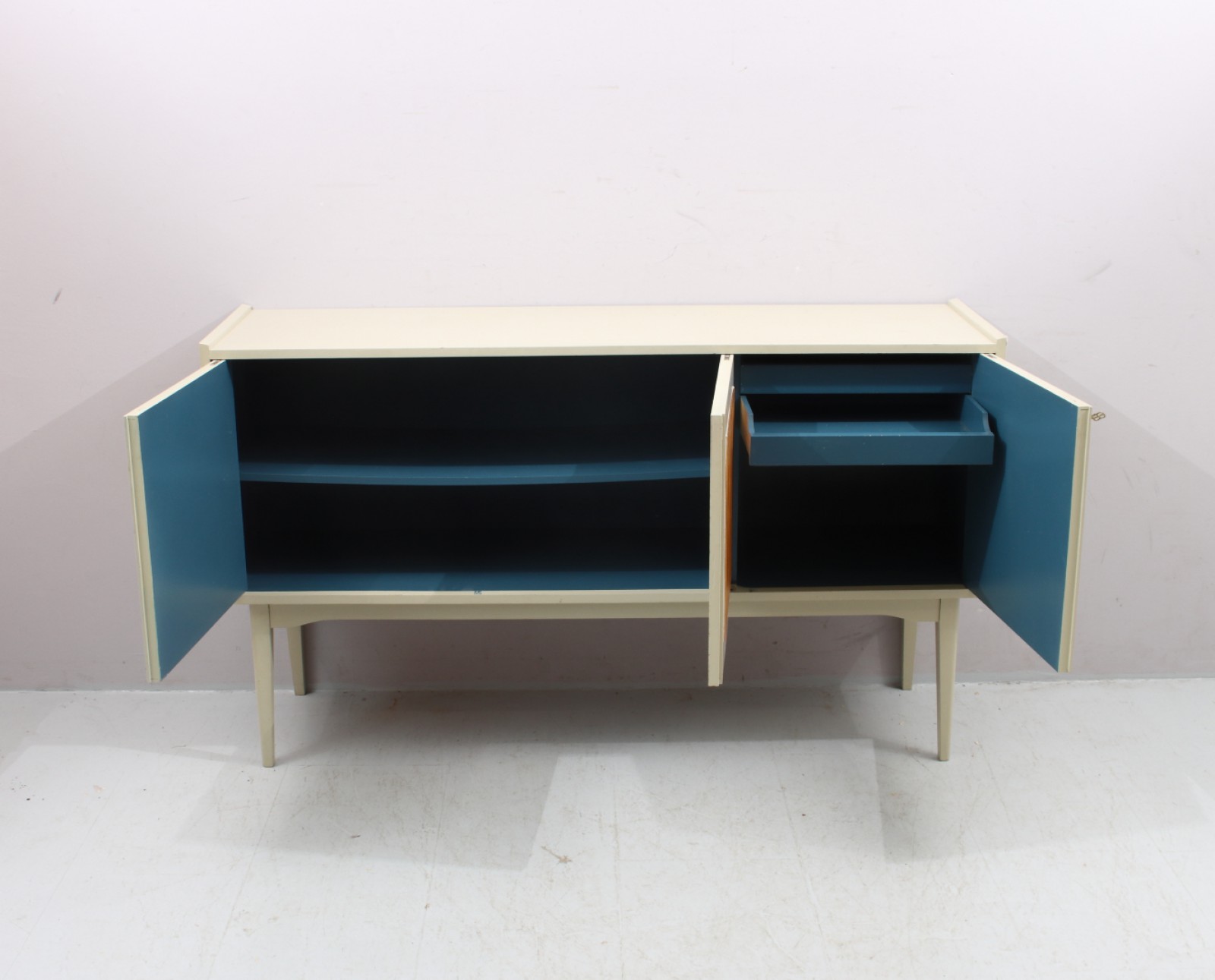 Lackerat trä, dörrar med teak, 1950,60-tal, åldersrelaterat slitage, H.87, B.150, Dj.43 cm. (vån1)