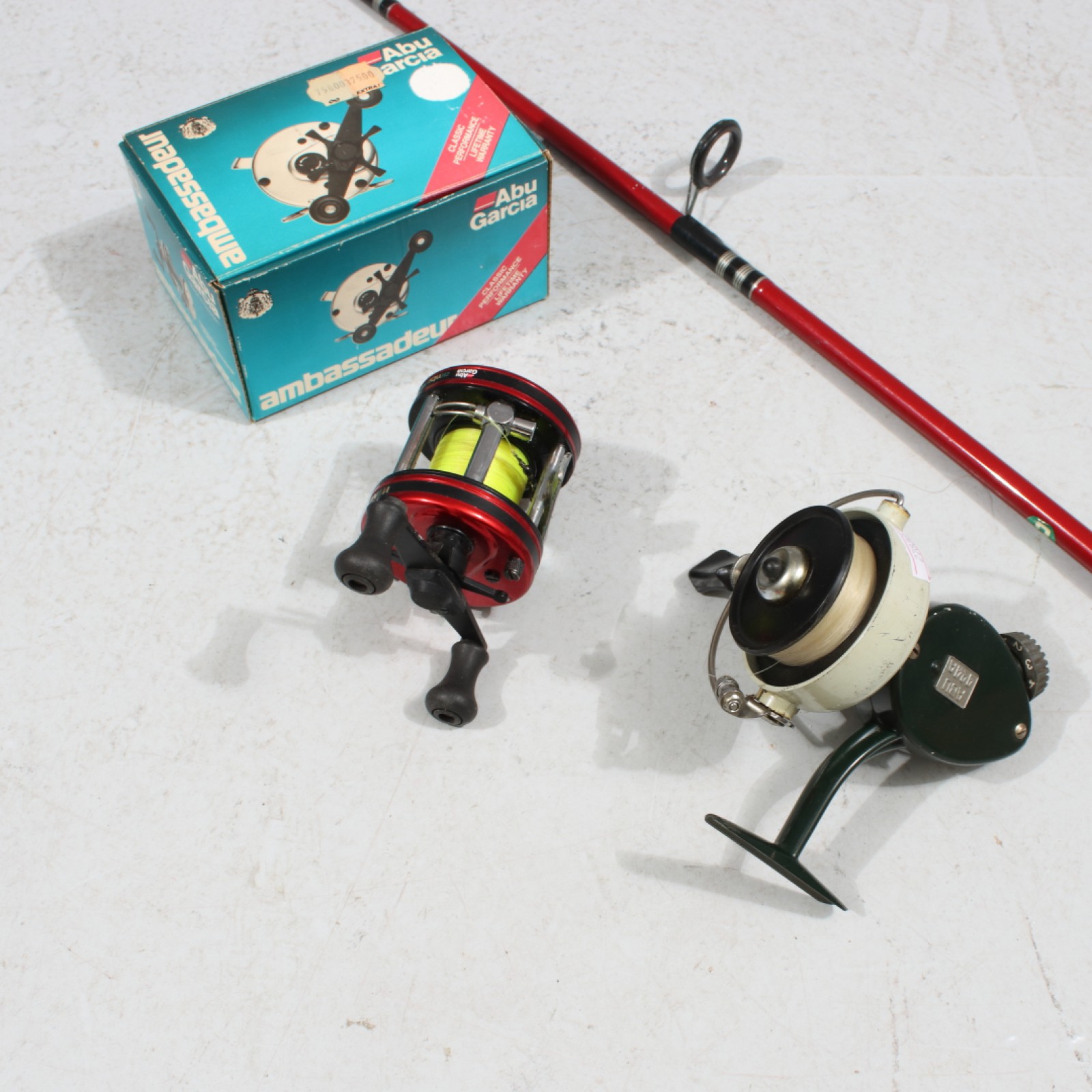 3 delar, 1st spö "ABU Garcia Four Star", 1st fiskerulle "ABU 444A" samt 1st fiskerulle ABU Garcia Ambassadeur 5000 med originalkartong". (vån3)