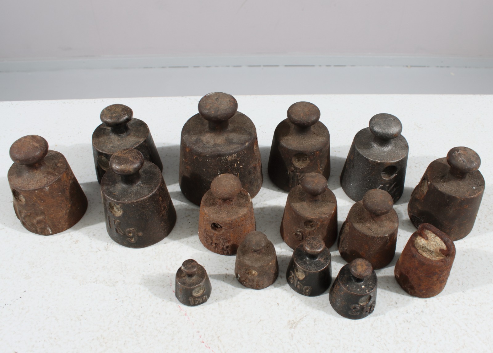 15 stycken, järn, 1st 2 kg, 6st 1 kg, 3st 5 hg, 3st 2 hg, 1st 1 hg samt 1st 1800-tal 1 skålpund. (vån3)