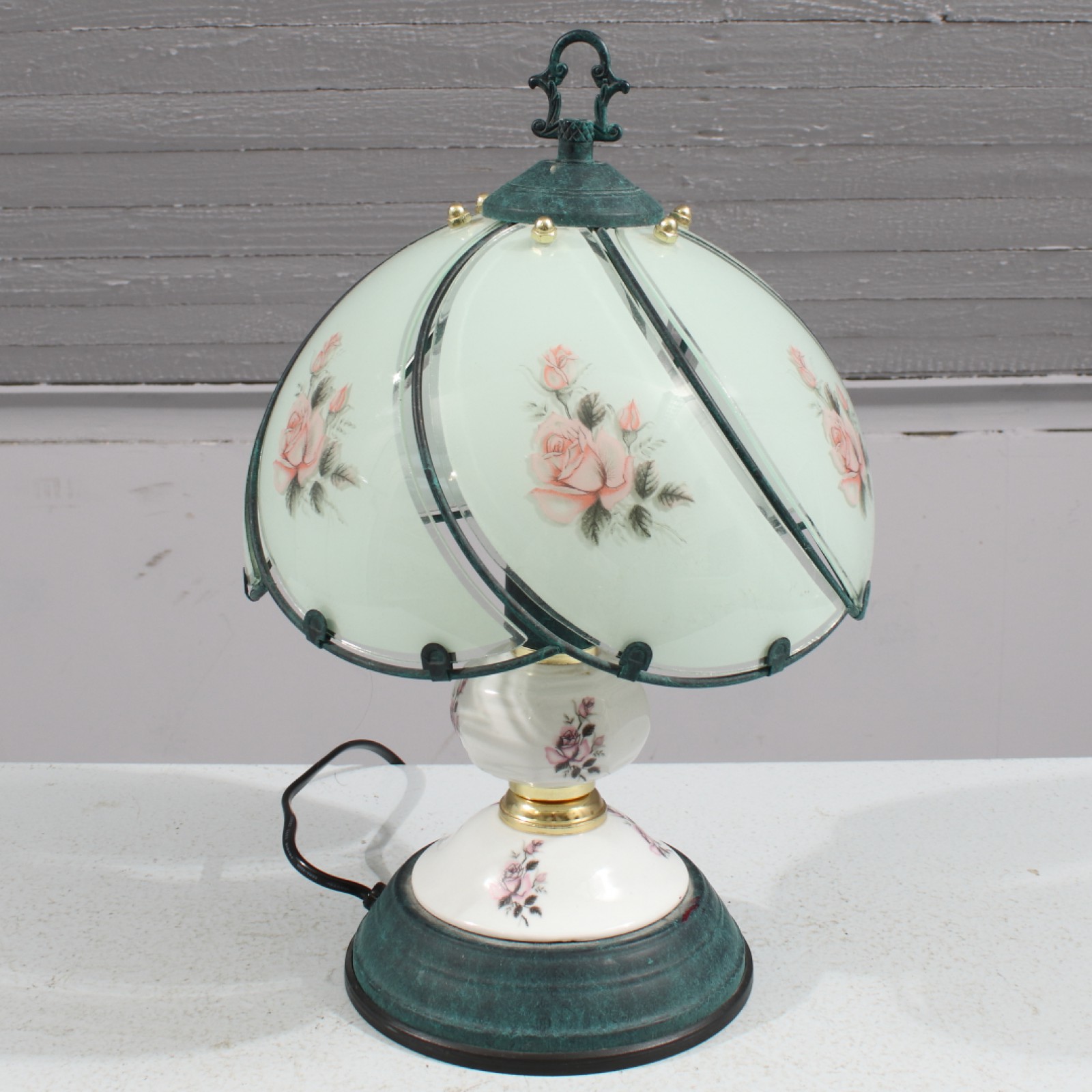 Fot i metall och porslin, skärm i metall och glas, tändning och släckning med touchfunktion (fungerar vid test), 1980,90-tal, höjd 35 cm. (vån3)