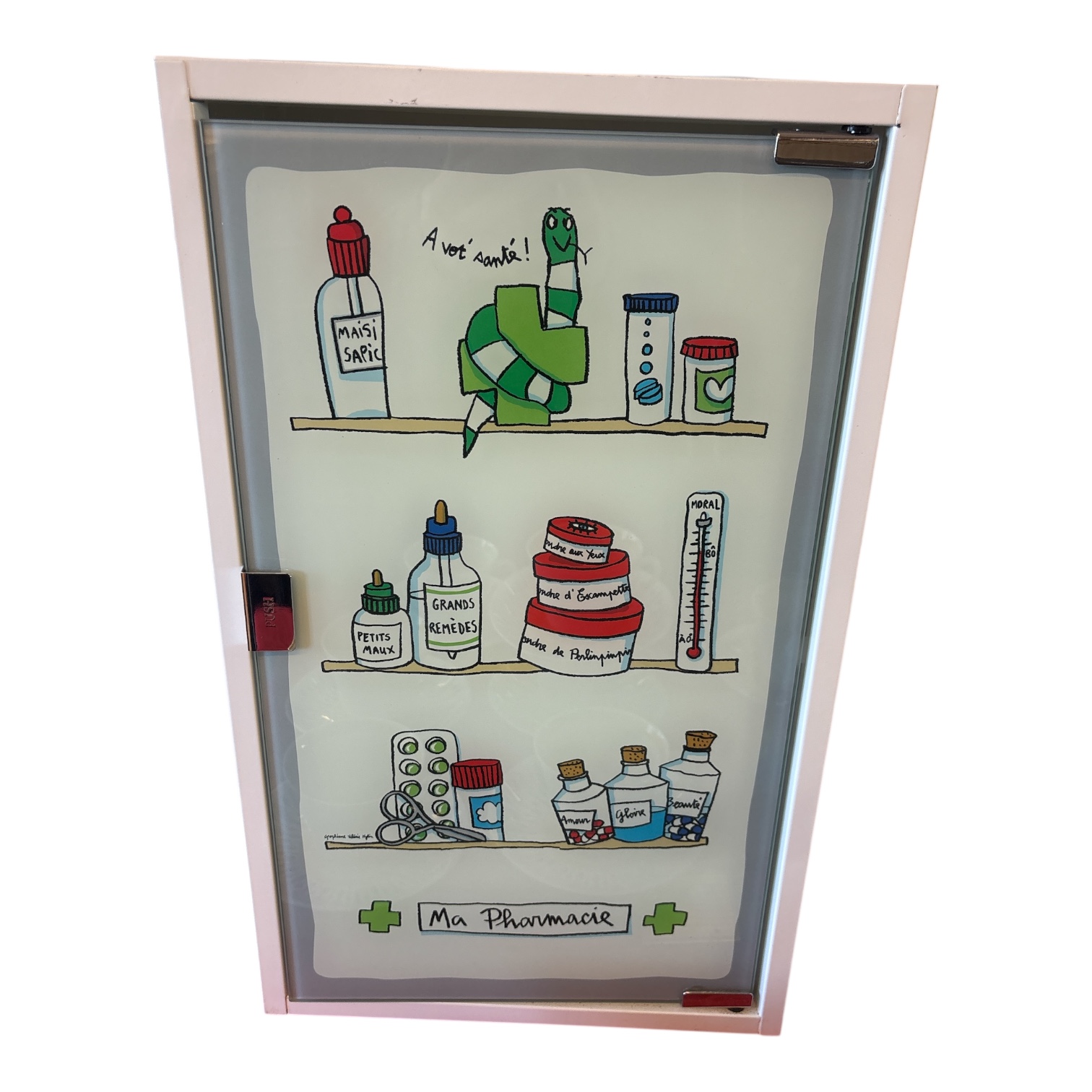 Charmigt retro medicinskåp med spegeldörr och tryckt motiv “Ma Pharmacie”.