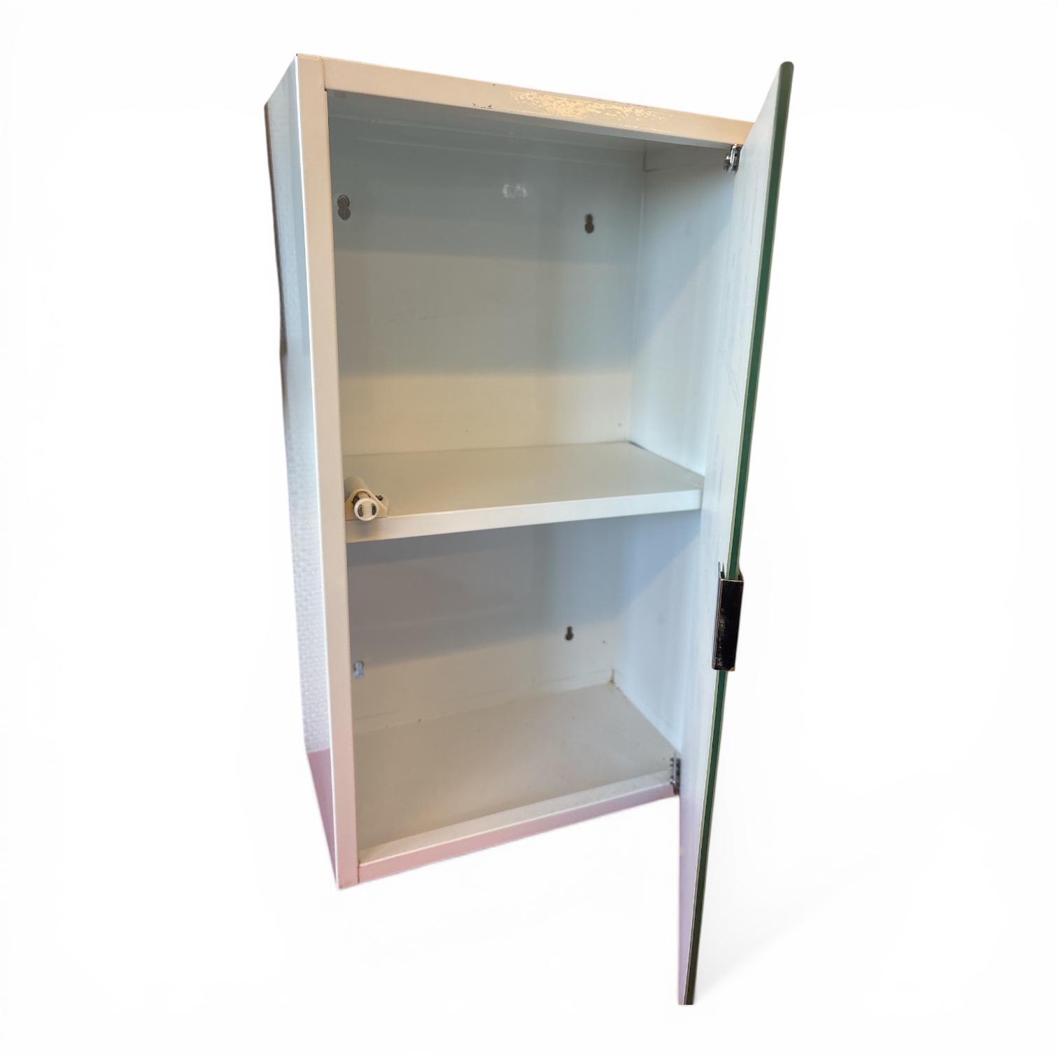 Tillverkat i metall med glas/spegel framtill. Inuti finns hyllplan för förvaring. Perfekt som badrumsskåp eller dekorativ inredningsdetalj i retrostil.