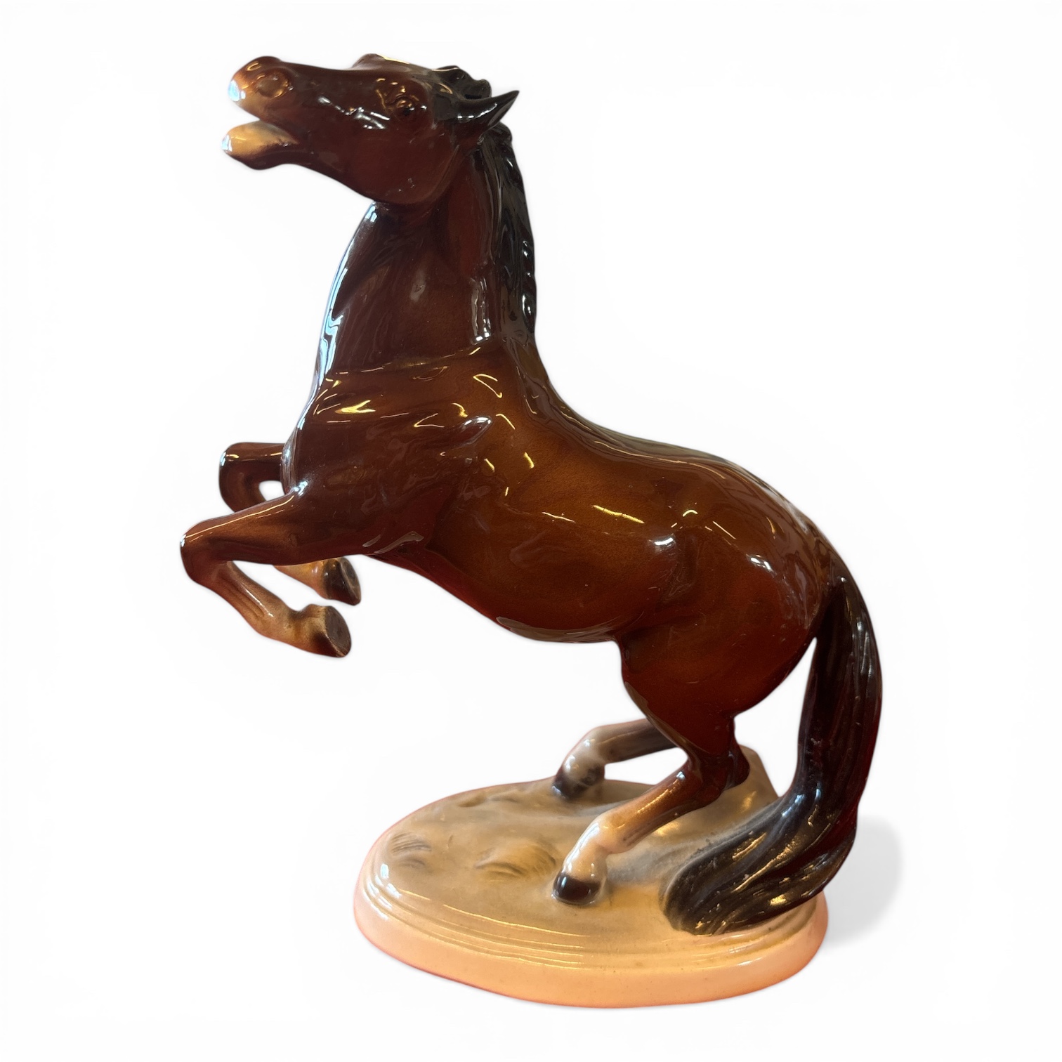 Porslinsfigur föreställande stegrande häst, tillverkad av Hertwig Katzhütte, Tyskland. 1900-tal.