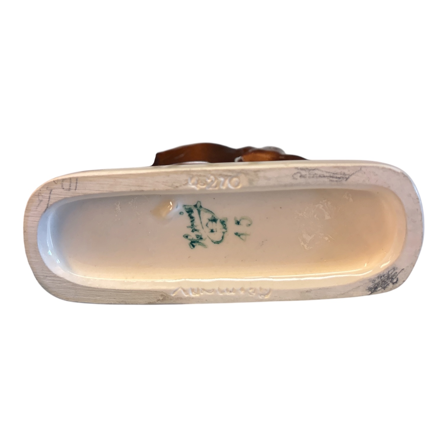 Två porslinsfigurer föreställande hästar på ovala baser. En märkt undertill med grön stämpel samt modellnummer.