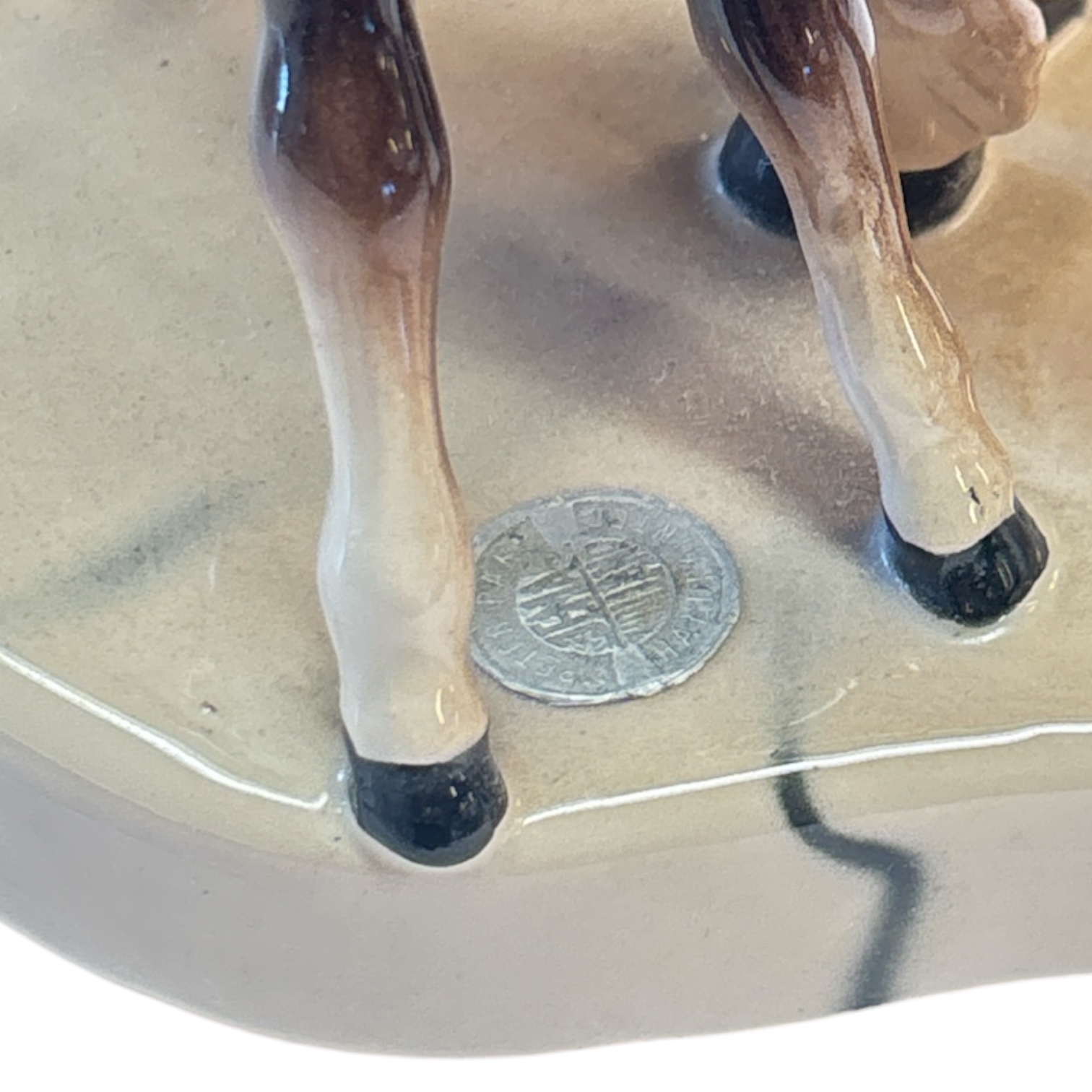 Keramisk figurgrupp föreställande sto och föl på bas. Märkt undertill med präglad stämpel “Holland”.