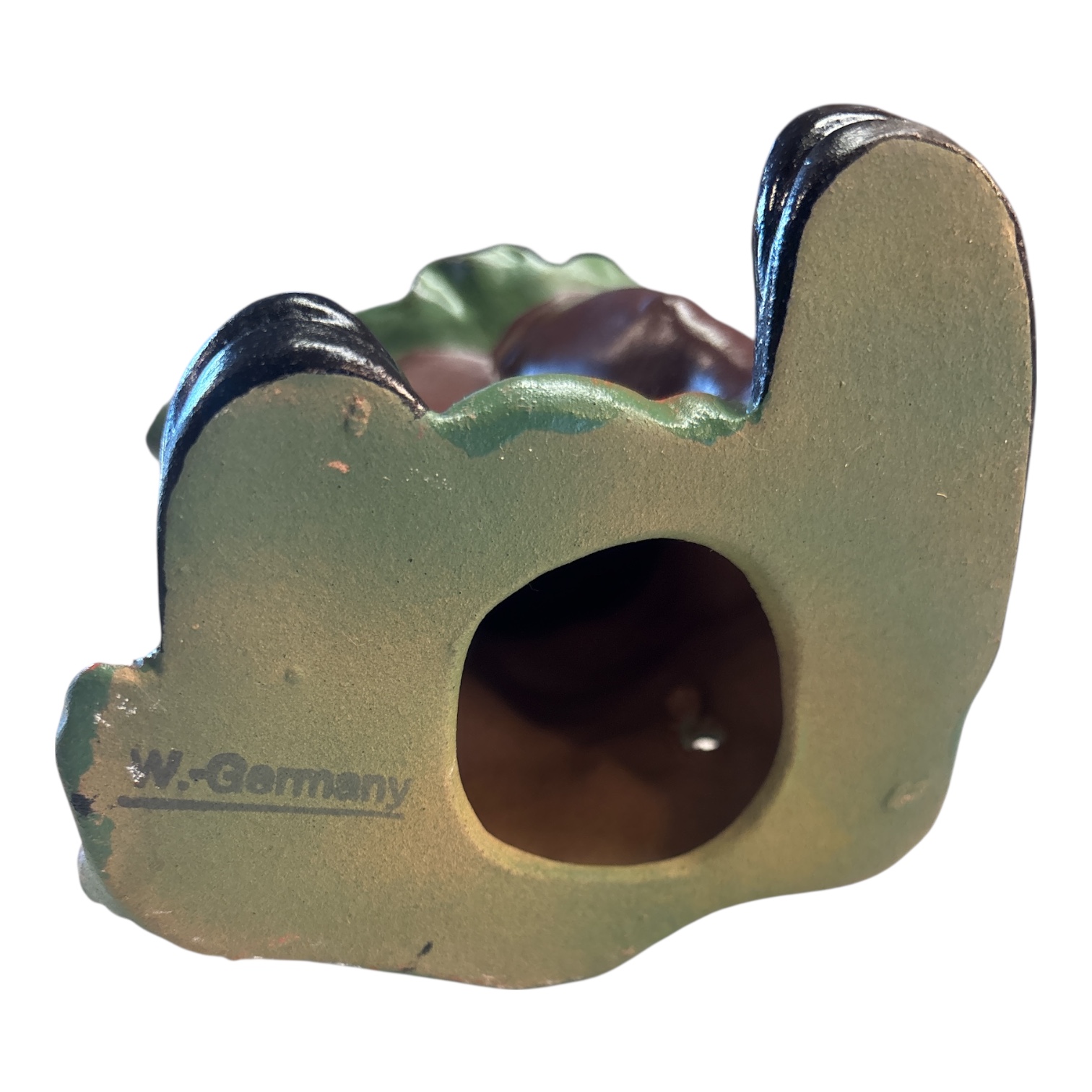 Tomtefigur i bemålat material, märkt undertill “W. Germany”, vilket daterar föremålet till Västtysk produktion under mitten av 1900-talet.