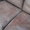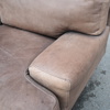 Brun skinnklädsel. Ben i borstad aluminium. Längd 225, djup 90, sitthöjd 43, höjd 75 cm.