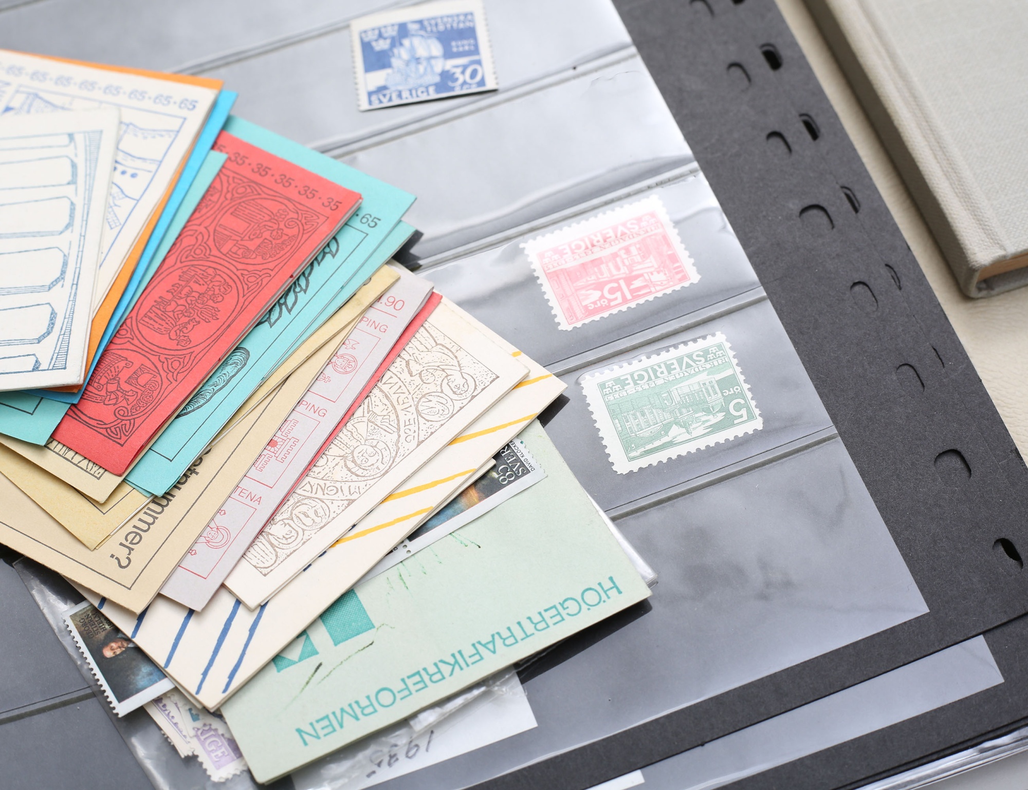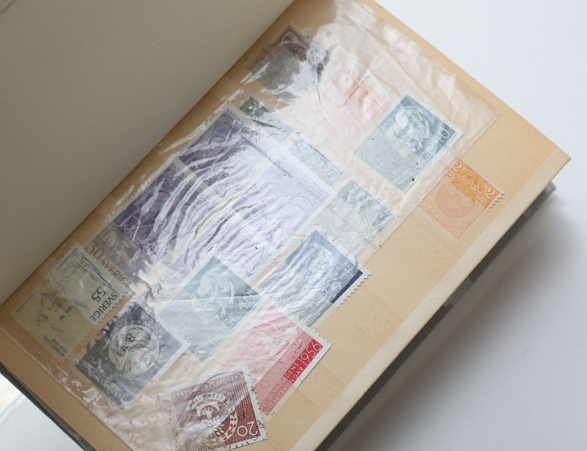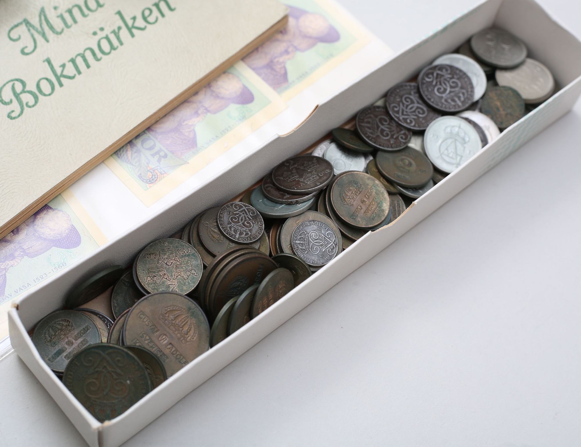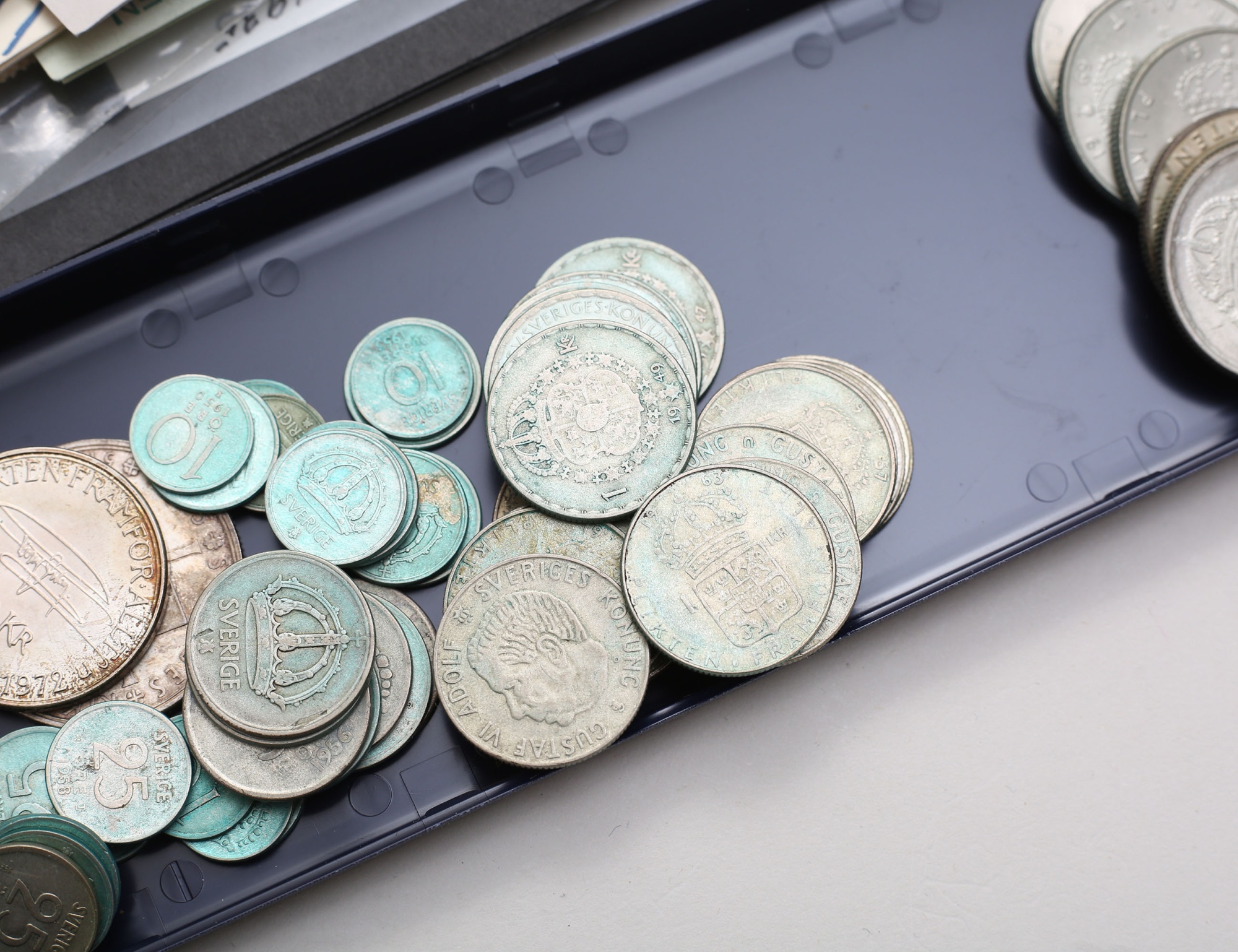 400/1000 vikt ca. 295 gram, 830-900/1000 vikt ca. 43 gram, diverse mynt, sedlar och bokmärken i album 1950/50-tal, frimärken Sverige stämplade och ostämplade m.m.