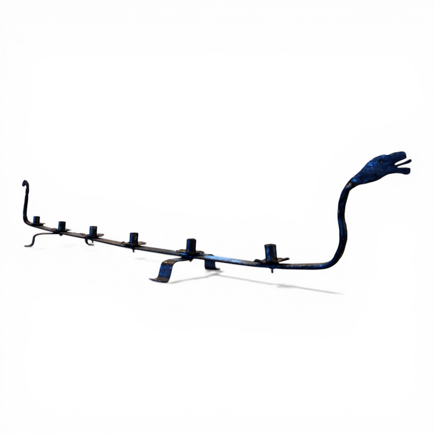 Material: SmidesjärnLängd: ca 125 cmAntal ljus: ca 6 stStil: Vikingatid / medeltid / allmogeSkick: Bruksslitage och patina som ger karaktär