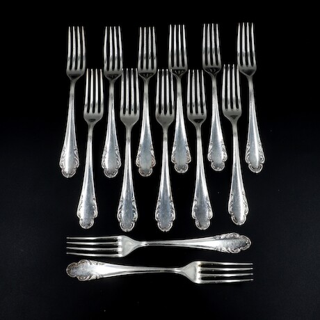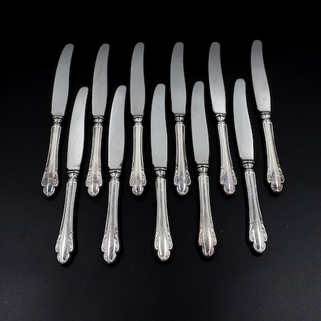 Bilder Bestickservis silver "Haga", 13st skedar L=21, 13st gafflar, 12st teskedar, 12st skedar L=18,5, vikt = 1923g, + 11st knivar med rostfria blad tot vikt = 588g