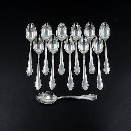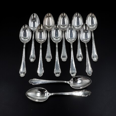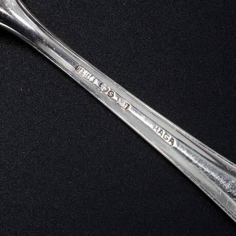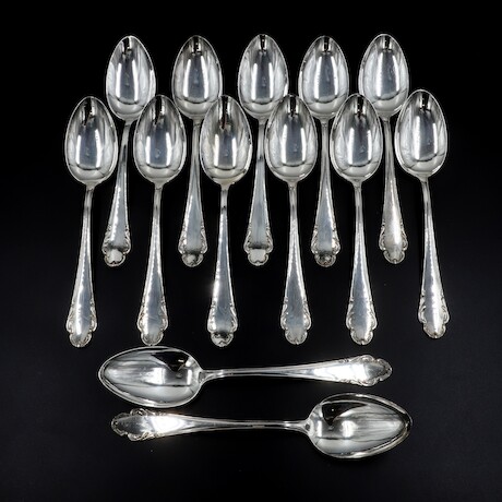 Auktioner Guld, Silver & Smycken Bestickservis silver "Haga", 13st skedar L=21, 13st gafflar, 12st teskedar, 12st skedar L=18,5, vikt = 1923g, + 11st knivar med rostfria blad tot vikt = 588g
