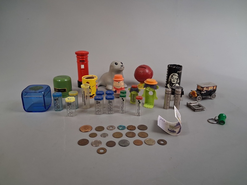 Bilder Diverse mynthållare, spargrisar, 20 sedel, mynt m.m.