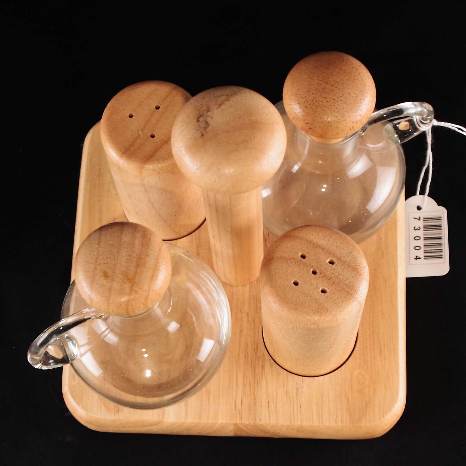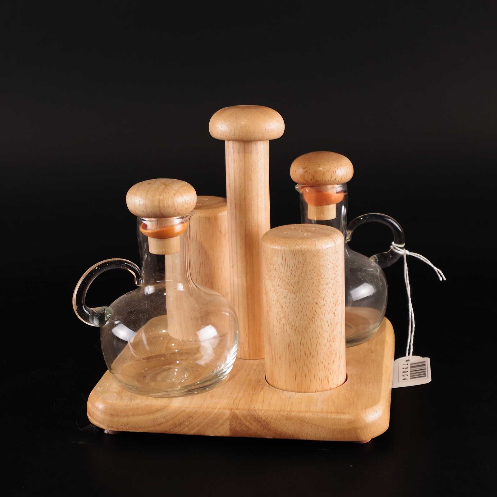 OLJE-VINÄGERSET med salt och pepparkar. Trä/glas. 16x16cm. H: 18cm.
