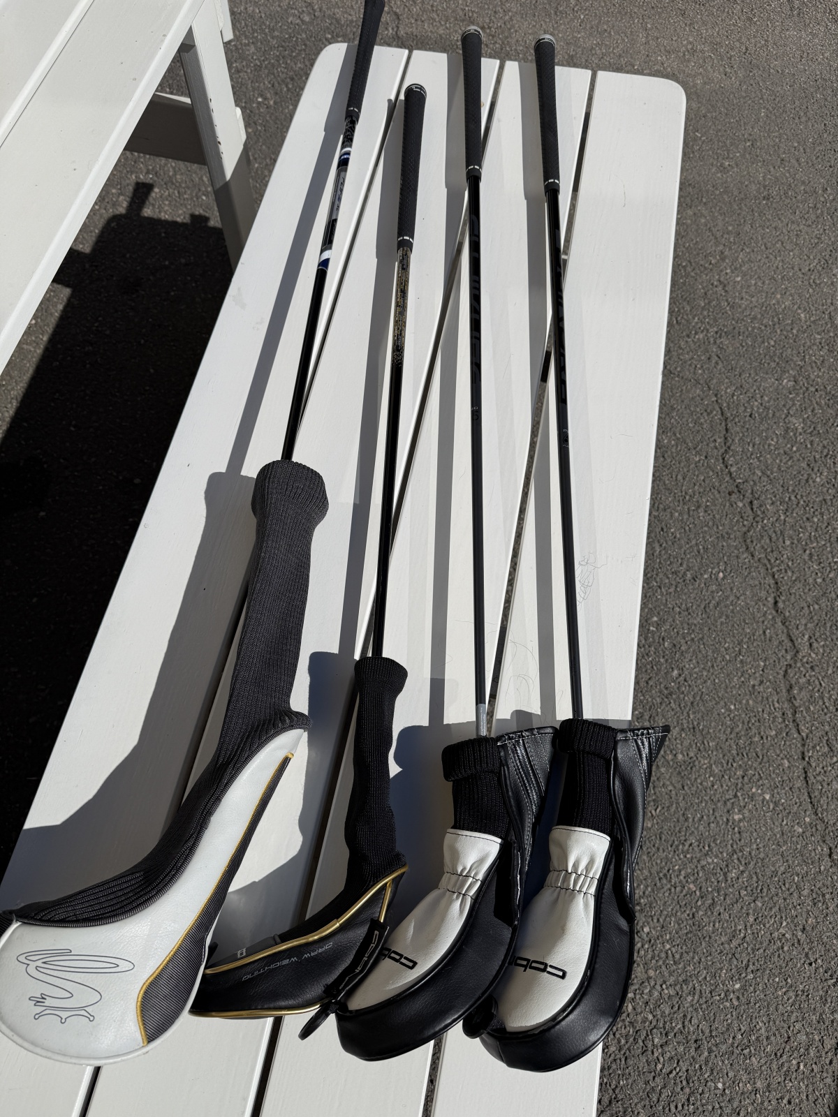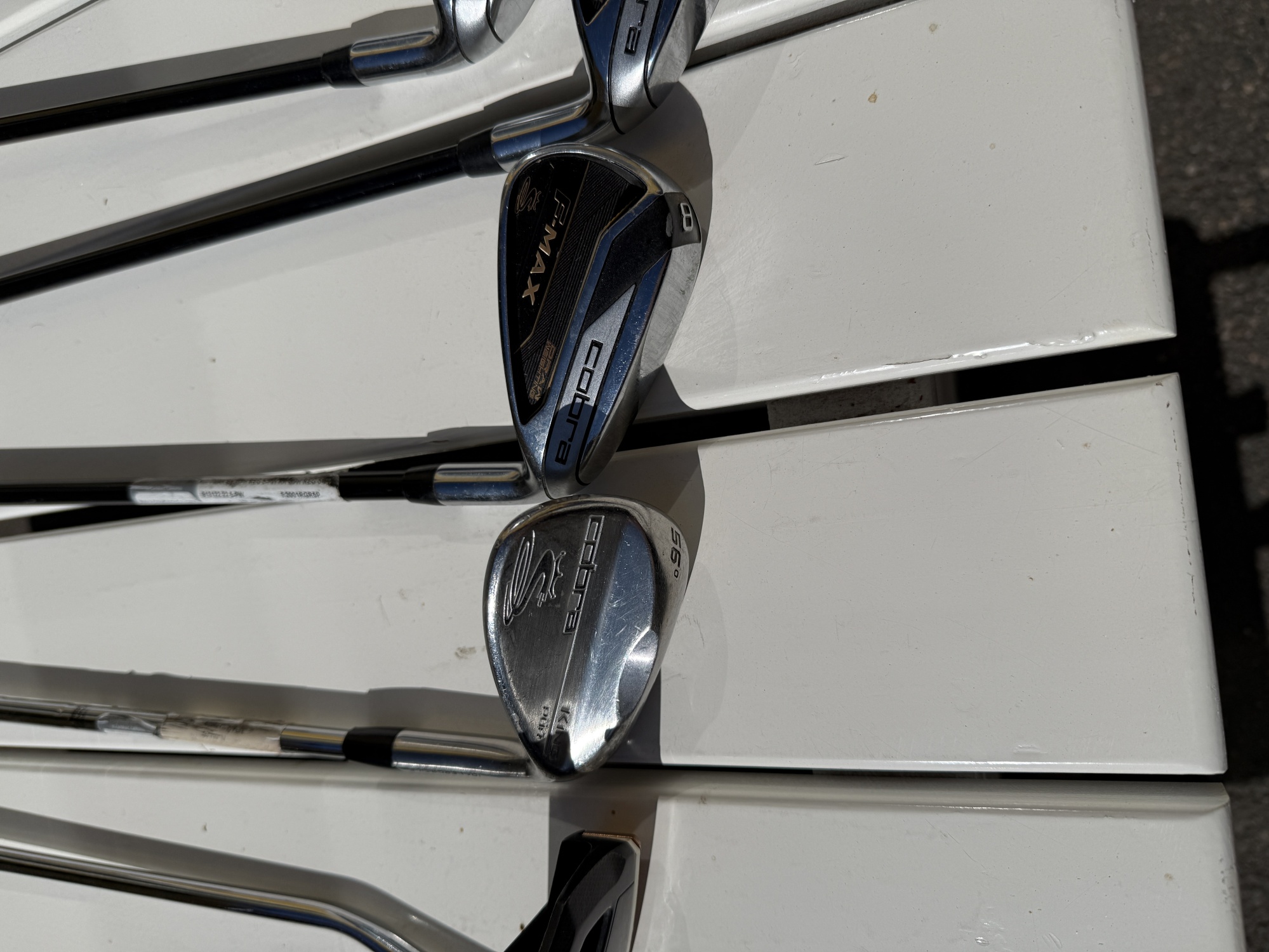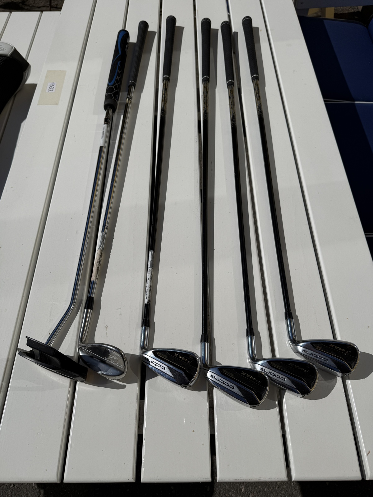 10 klubbor. Putter Clevland Golf Halo samt fairwaywoods Cobra King F7 Black, regular skaft, justerbara loft (5-6W, 7-8W). Hybrid Cobra F-Max, regular skaft. Driver Cobra FLY-Z XL. regular skaft, 10,5°. Järnset Cobra F-Max, 7-PW, grafitskaft regular (6 och 5 saknas). Wedge 56°, Cobra King Pur. Bruksslitage, fattning på alla klubbor är höger.
