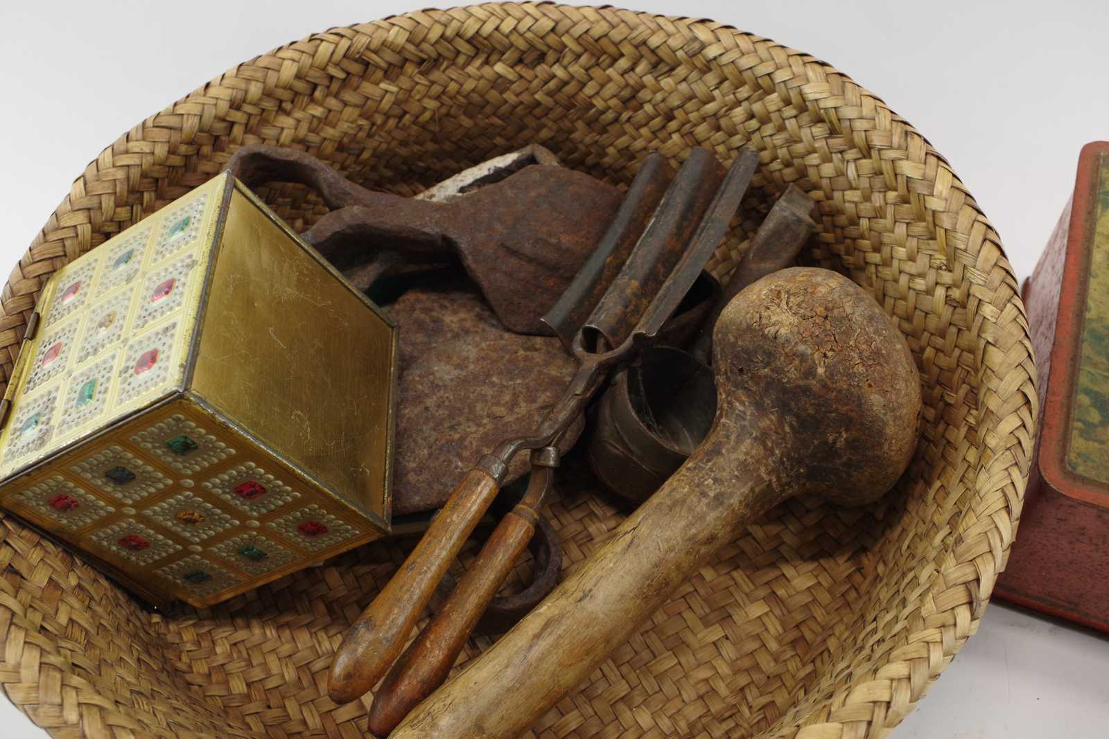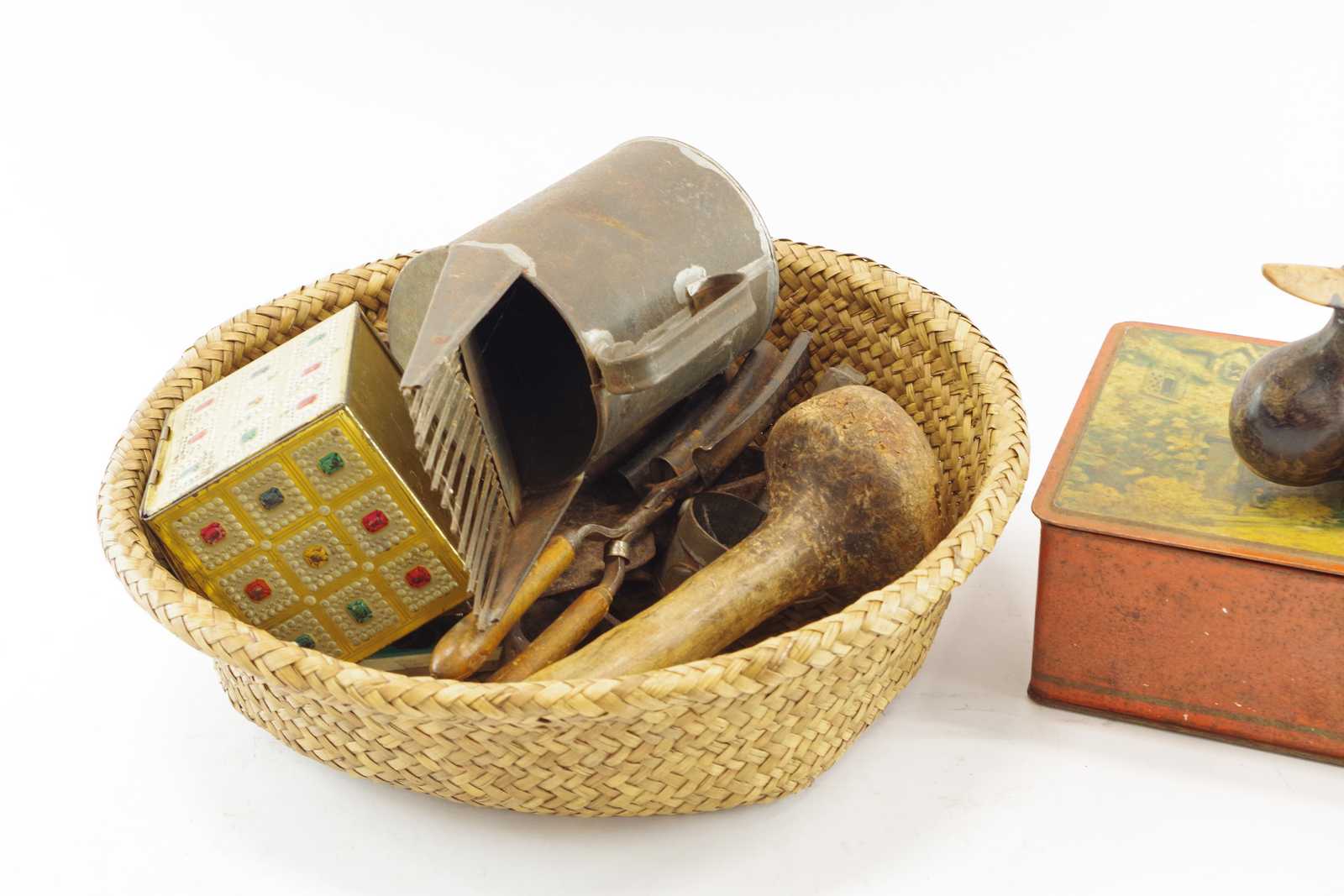 BÄRRENSARE, PLÅTBURKAR, LOCKTÅNG, TRÄFÅGEL, KORG D:34 cm, mm
