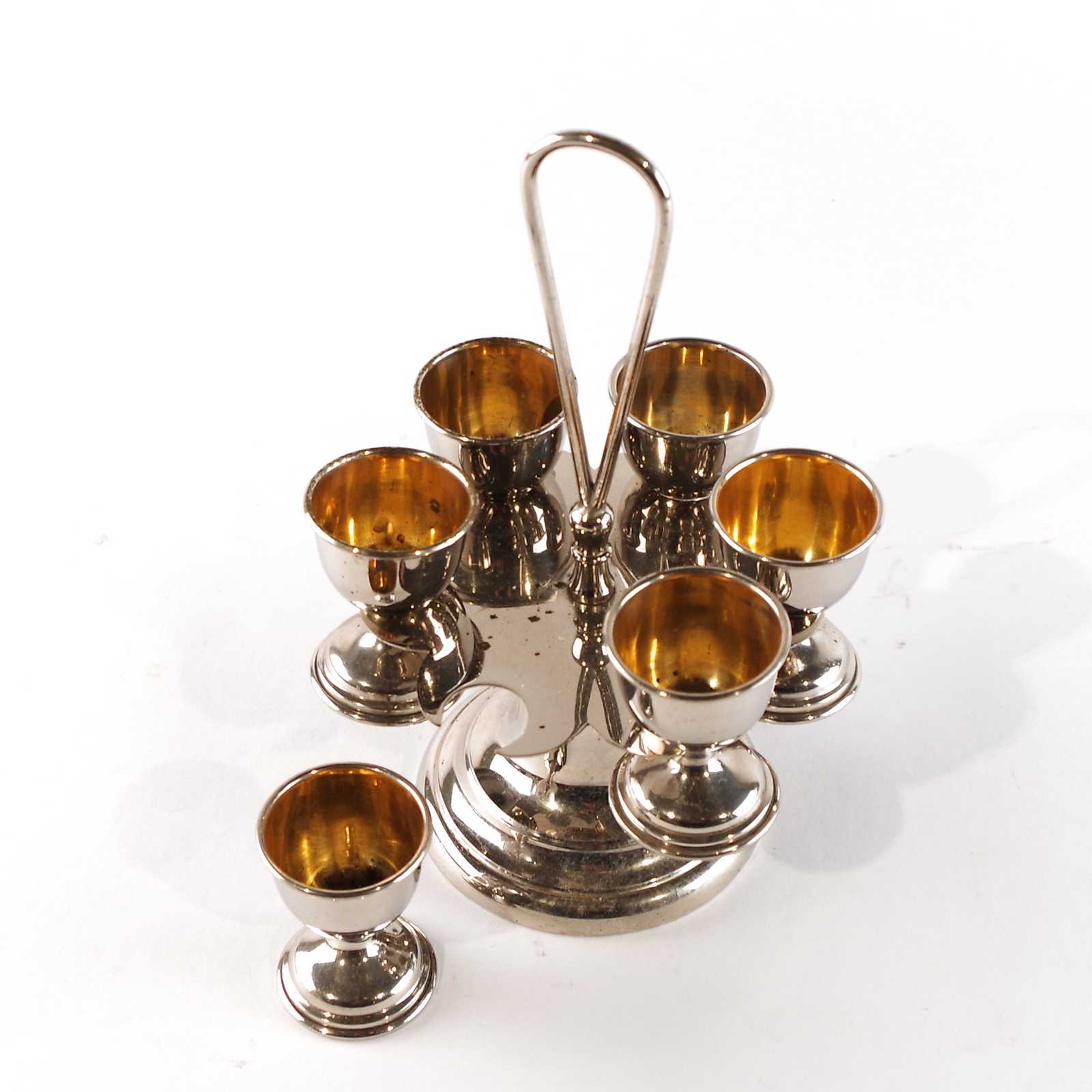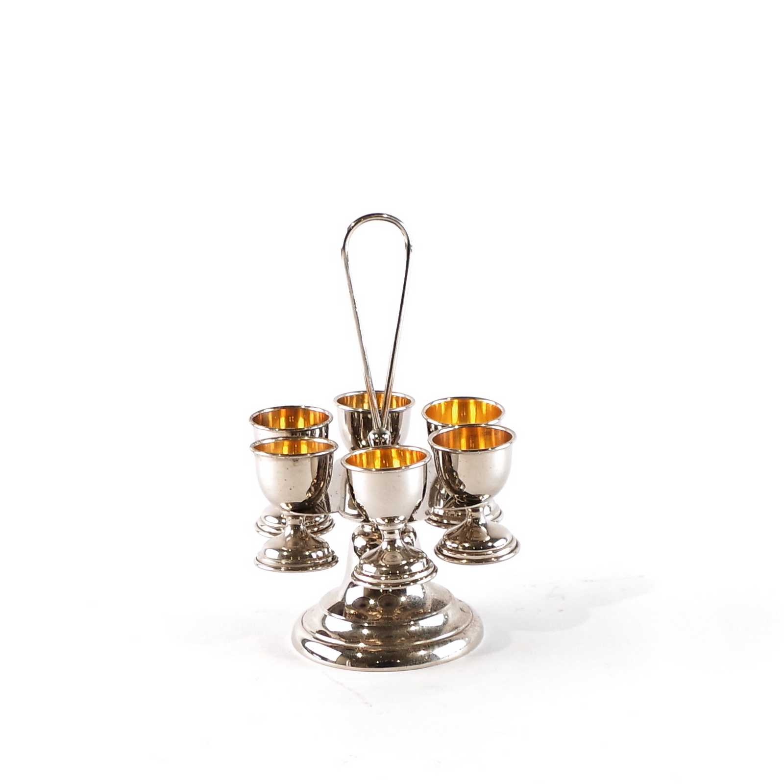 ÄGGKOPPAR 6st äldre med ställ, äldre, vitmetall. H:22cm totalt.