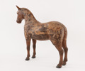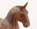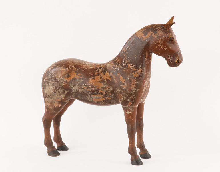 Skulpterad och bemålad trä. Öron av läder.