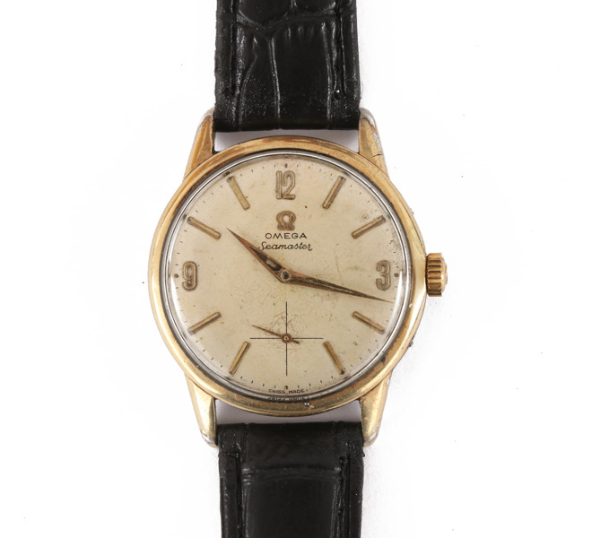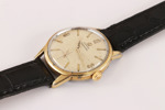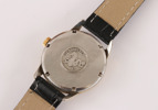 Mekaniskt. Guld på stål. Svart läderarmband.