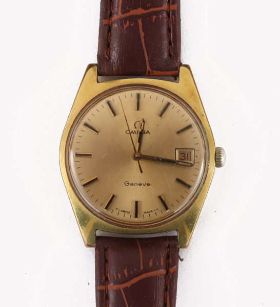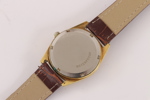 Förgylld stålboett. Mekaniskt. Med datumangivelse. Brunt läderarmband.