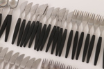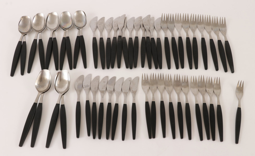 Rostfritt stål och plast. Bordsskedar 14st, bordsknivar 12st, bordsgafflar 9st, smörgåsknivar 8st samt smörgåsgafflar 11st.