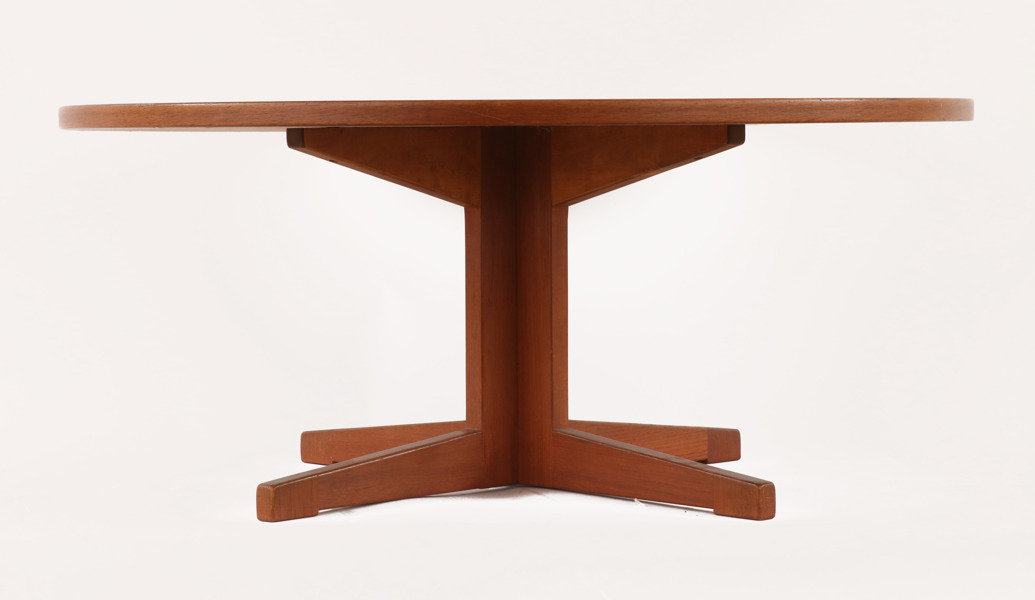 Teak. Rund skiva. Fyrdelad fot.
