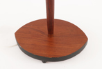 Kopparfärgad metall och teak. Två ljuspunkter.