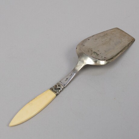 Auktioner Guld, Silver & Smycken Kakspade, silver och horn, CG Hallberg, Stockholm, 1929, längd 22 cm, vikt endast Spade 55.6 gram