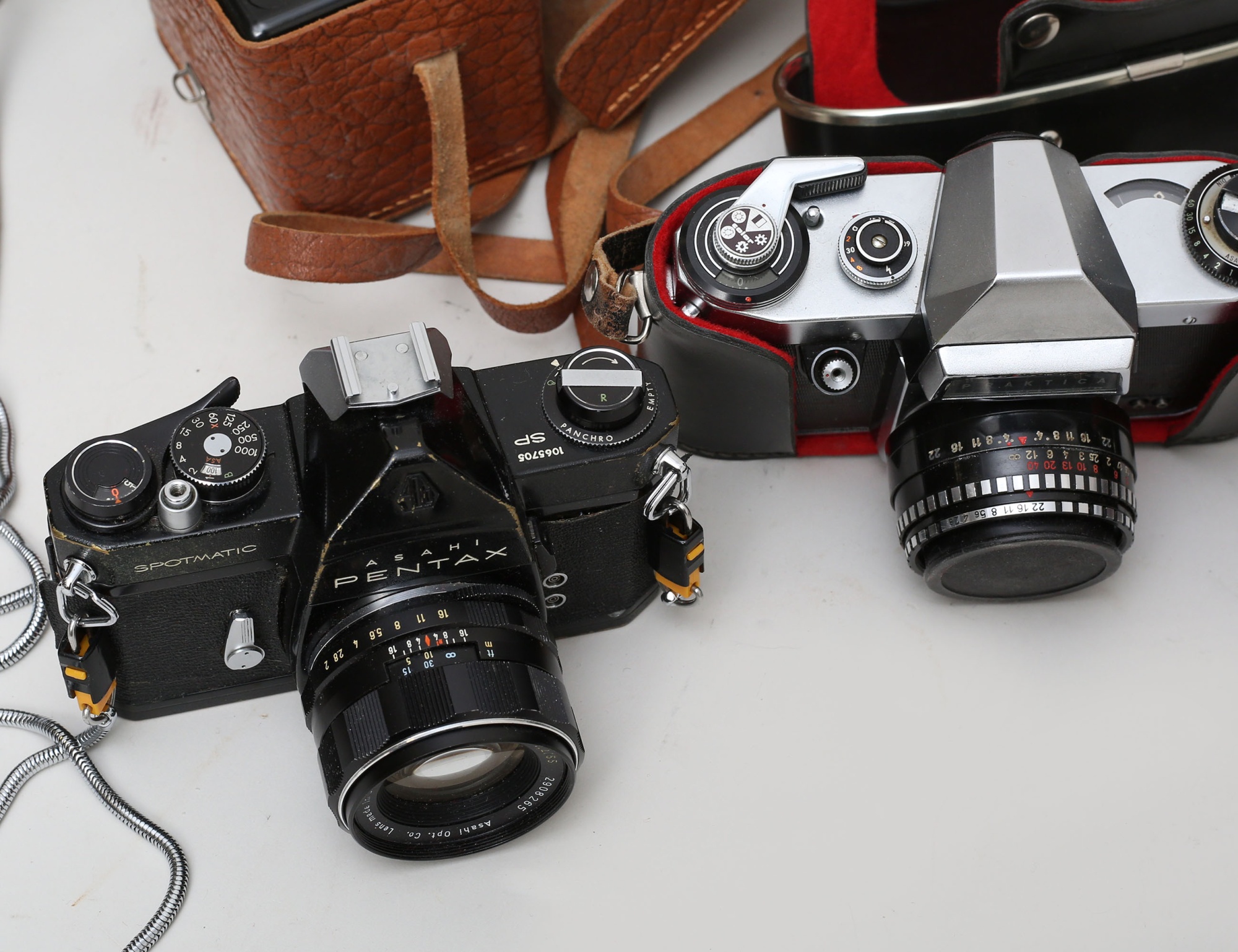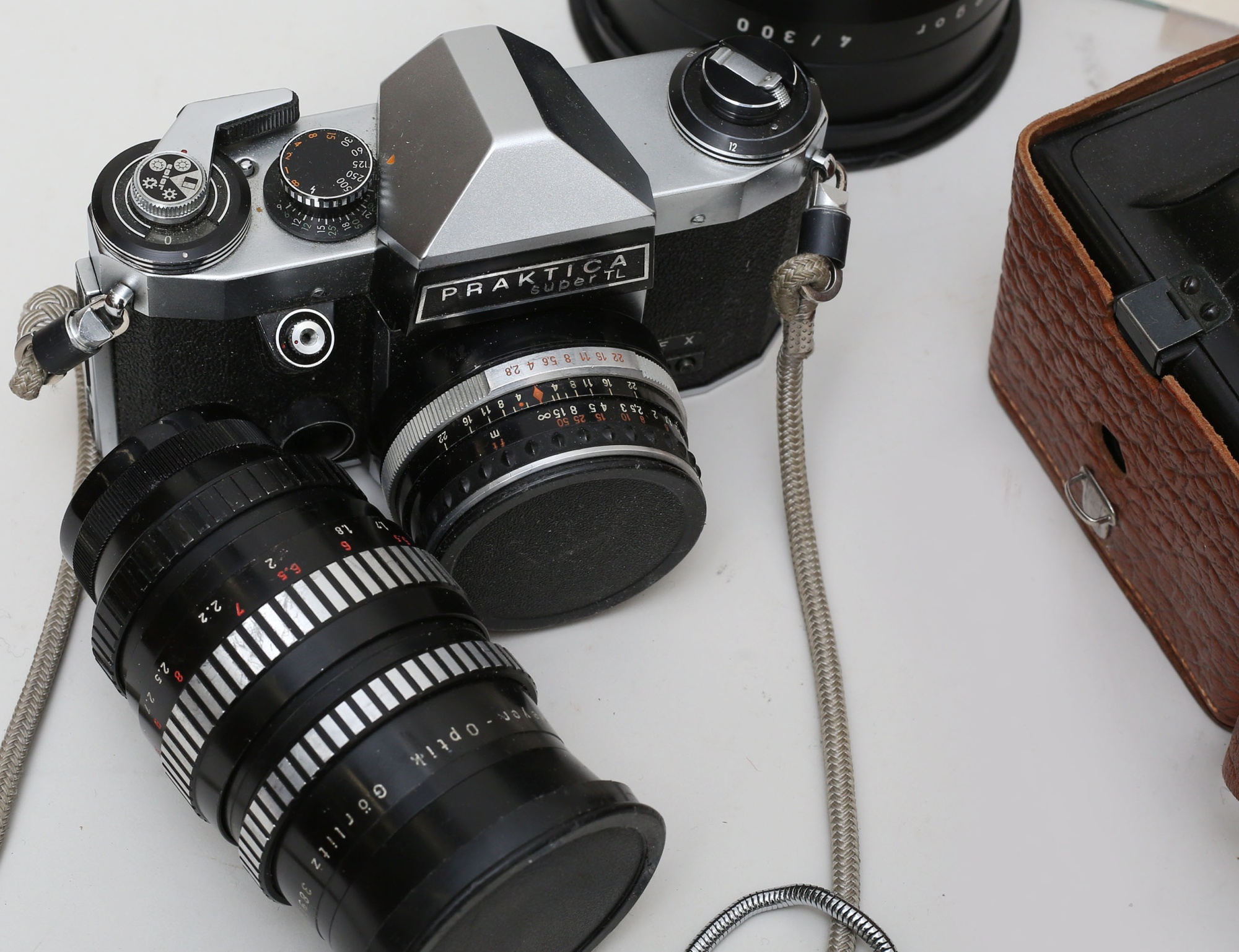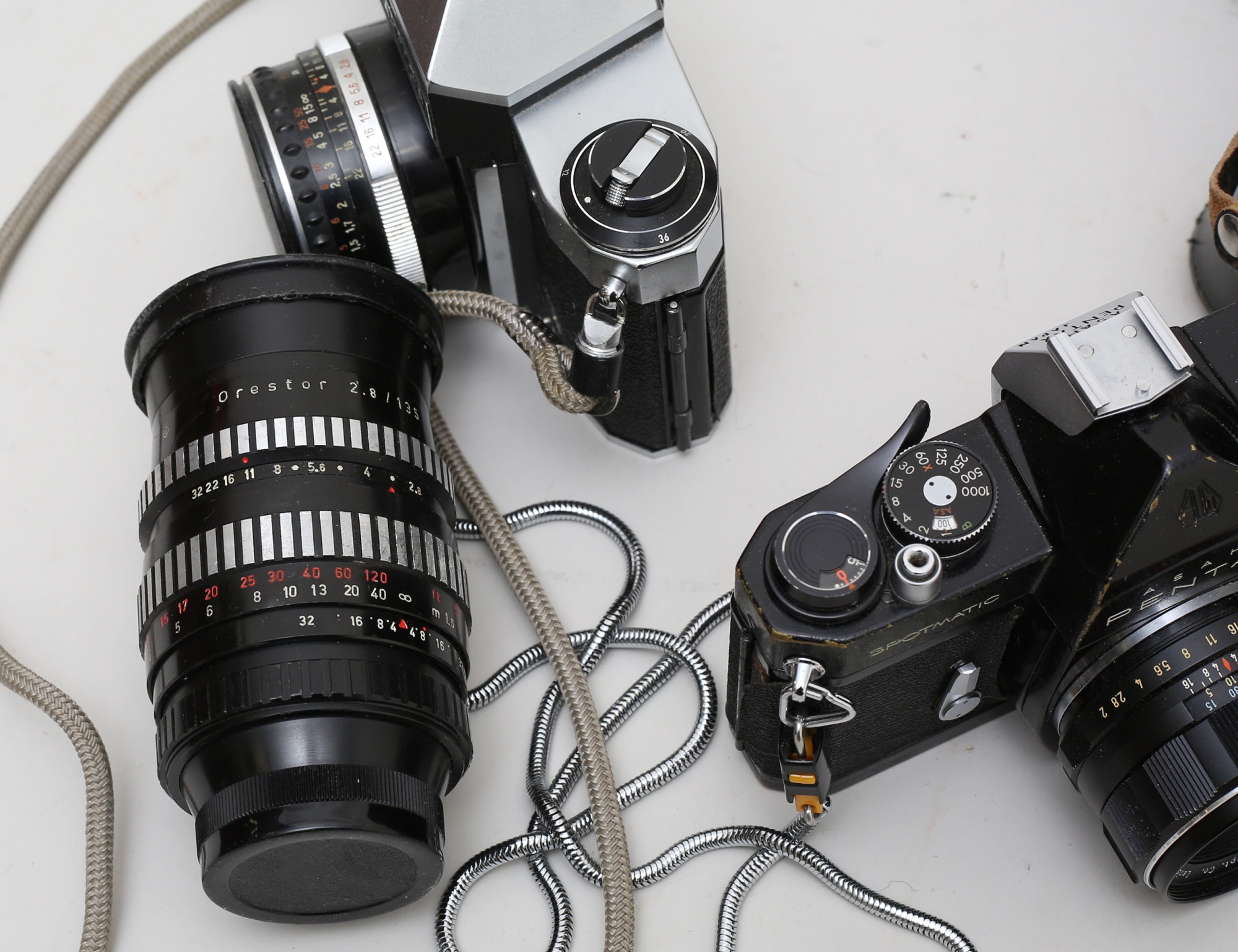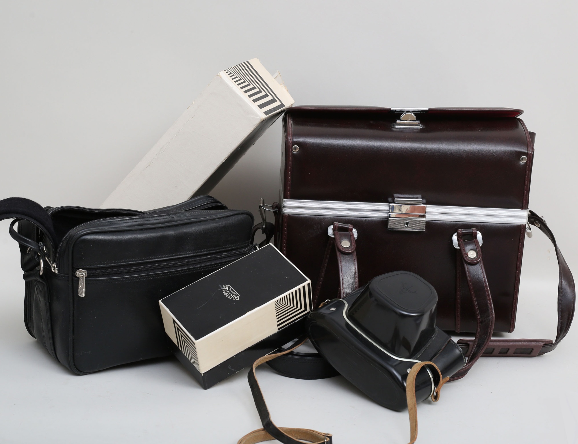 2 objektiv Meyer Optika Görlitz, längd 12/25, kamera Asahi Pentax Spolmatic, kamera Praktica Tuova B, kamera Unibox, diverse tillbehör och väskor