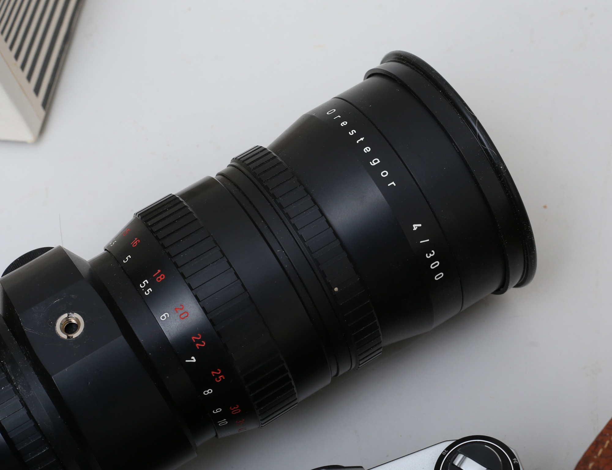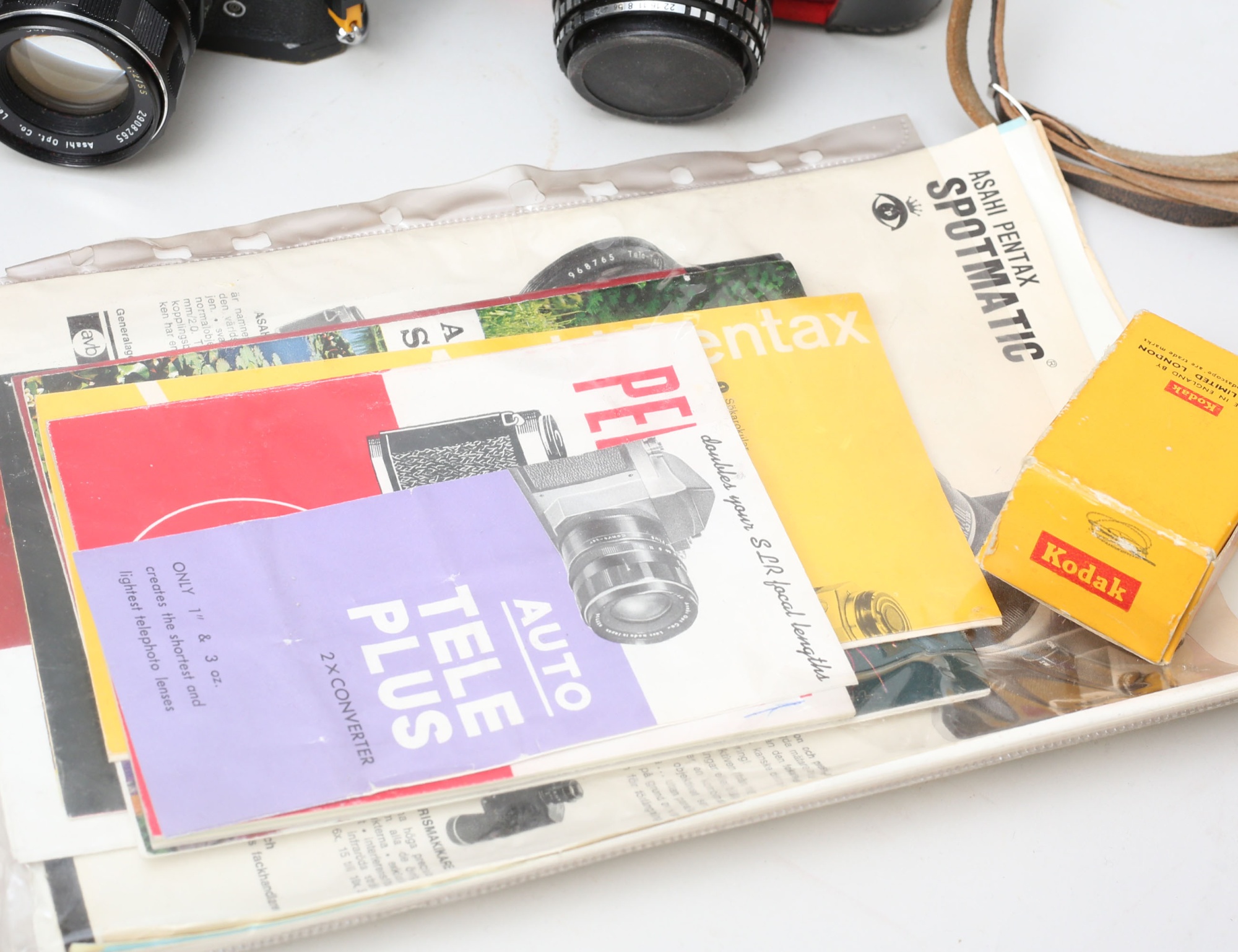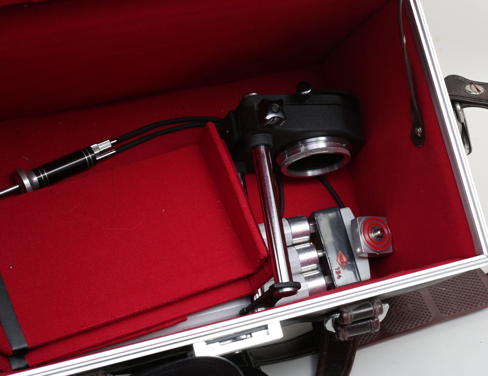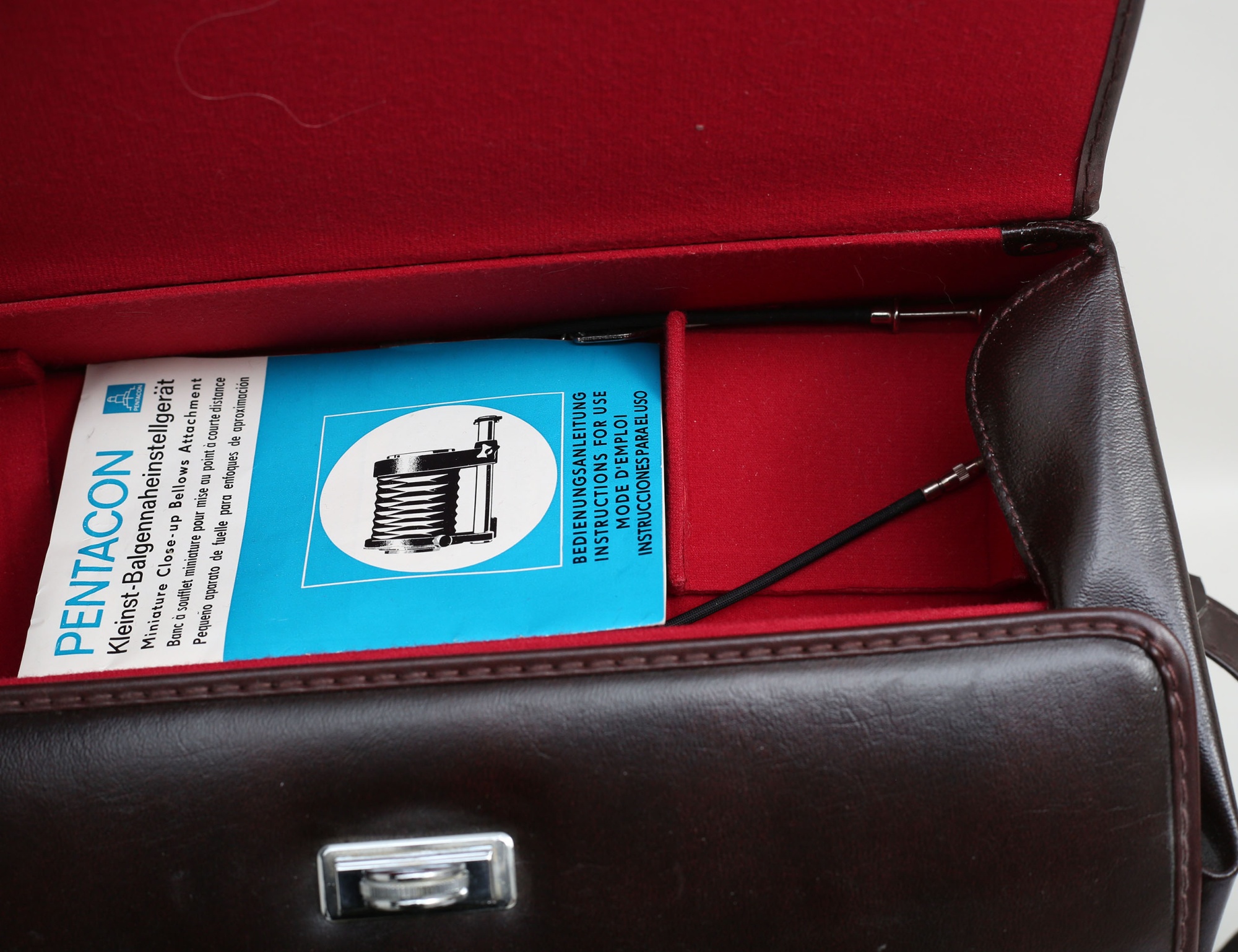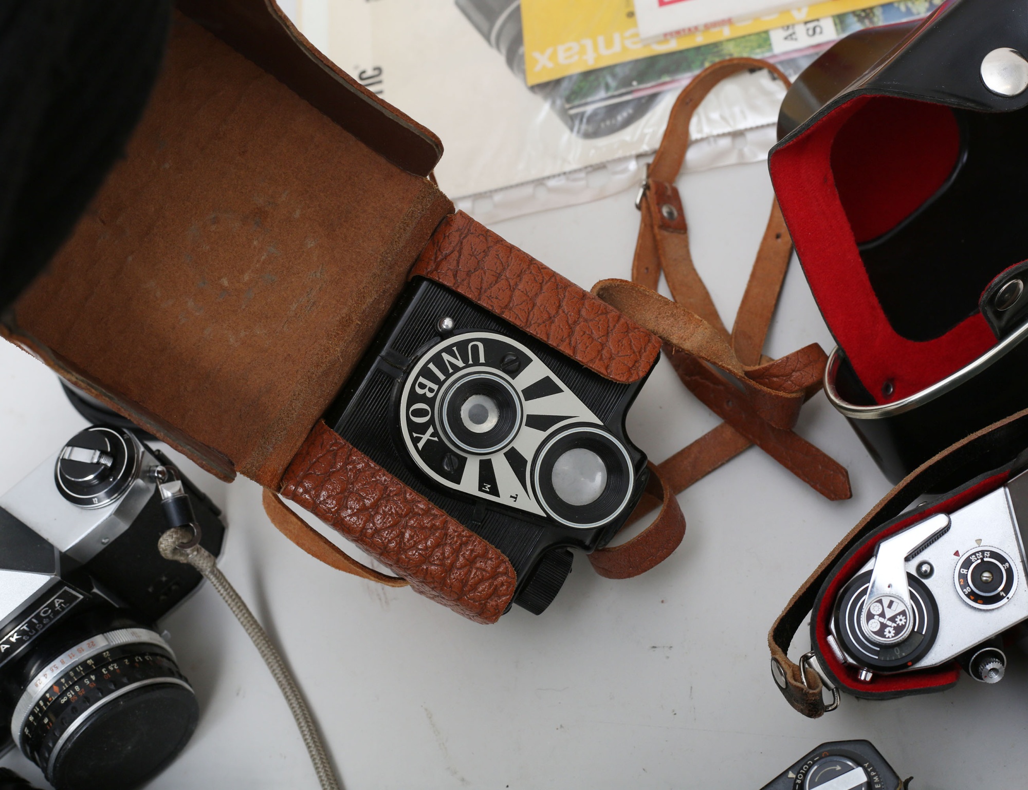 2 objektiv Meyer Optika Görlitz, längd 12/25, kamera Asahi Pentax Spolmatic, kamera Praktica Tuova B, kamera Unibox, diverse tillbehör och väskor
