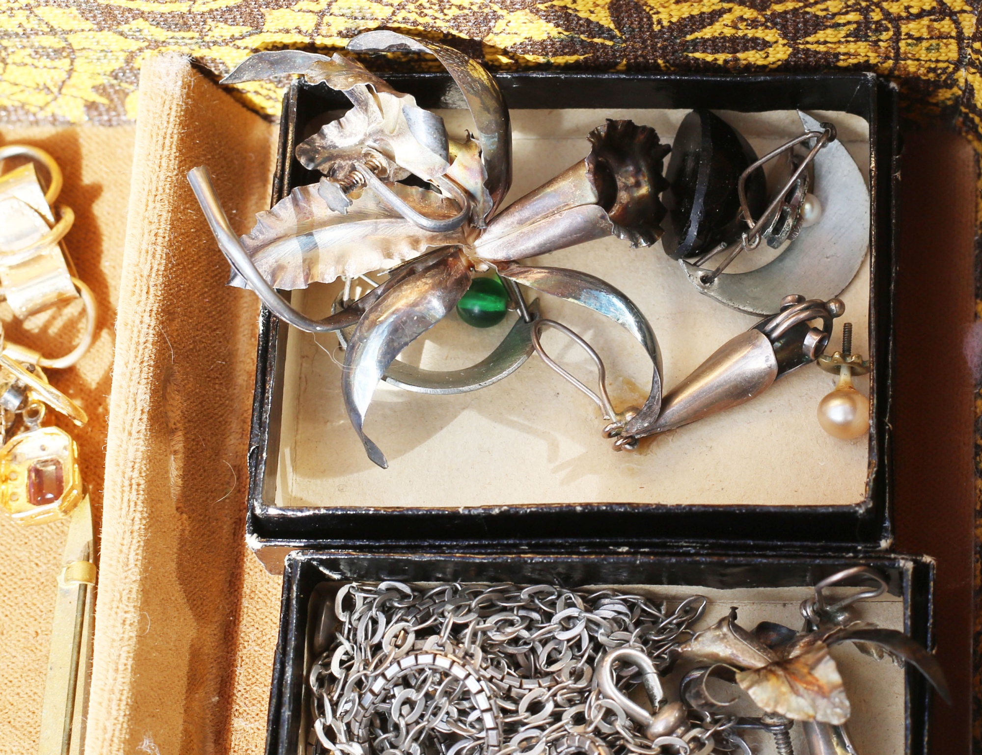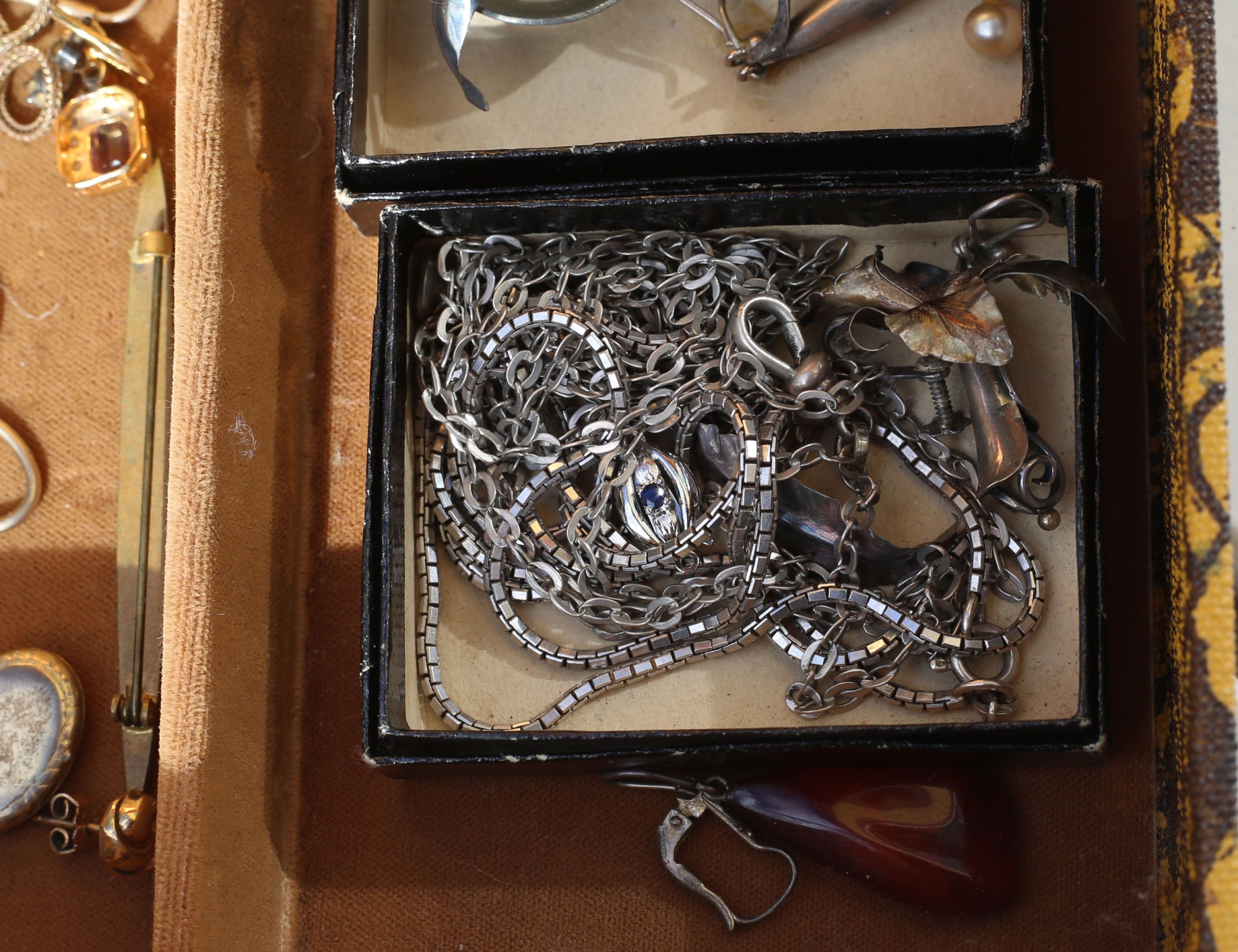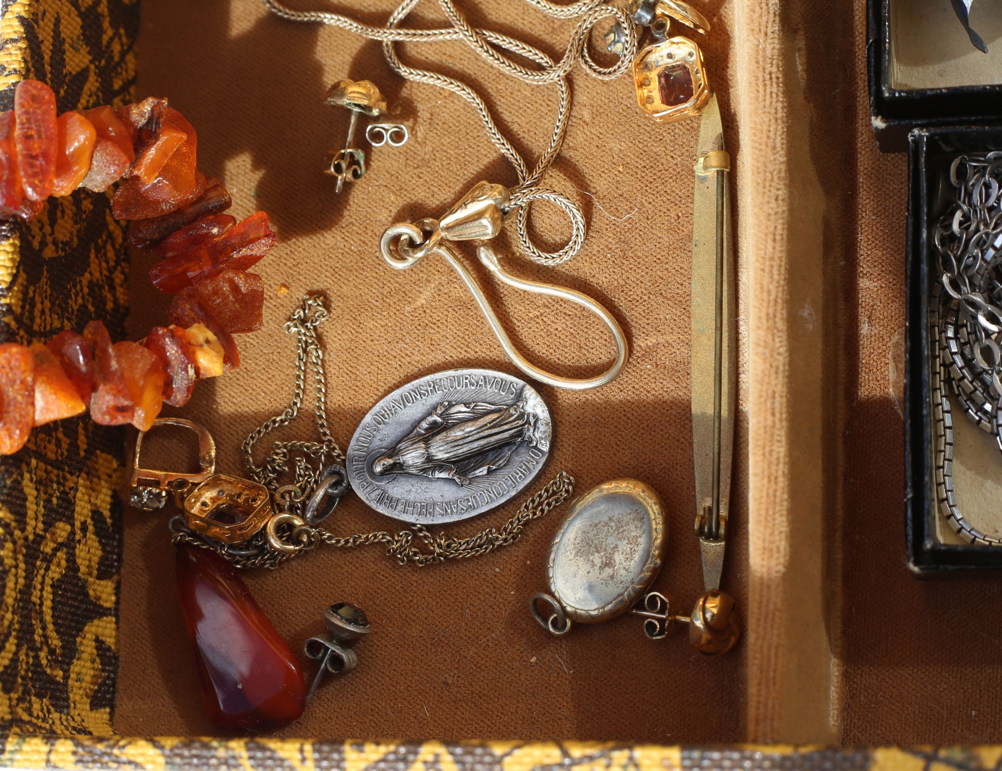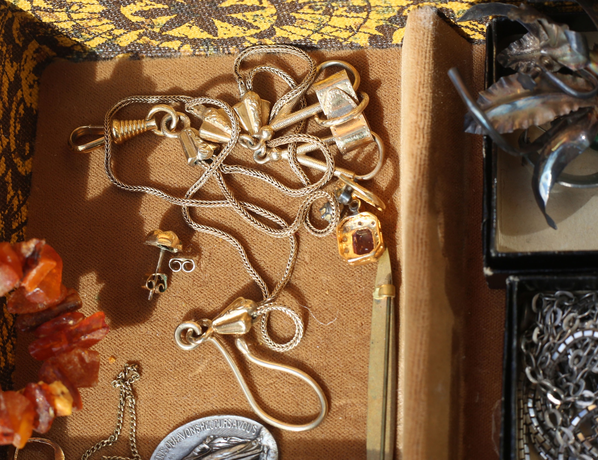 bla. klockkedja förgyllt silver c.1850, halskedjor m.m., halscollier bärnsten, äldre smycken double m.m.