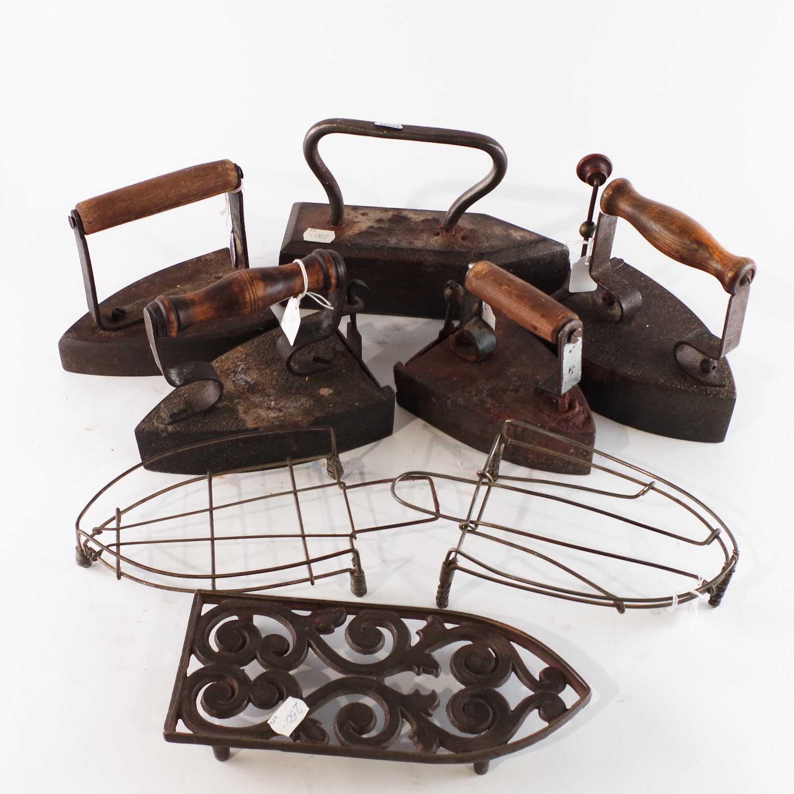 parti STRYKJÄRN samt STÄLL, gjutjärn, tidigt 1900-tal.