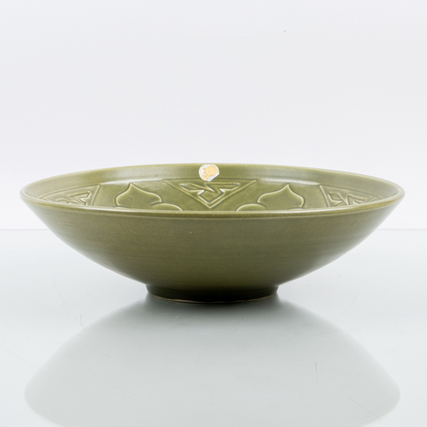 Grön glasyr, reliefdekor, etikettmärkt, höjd ca 7, diameter 26 cm