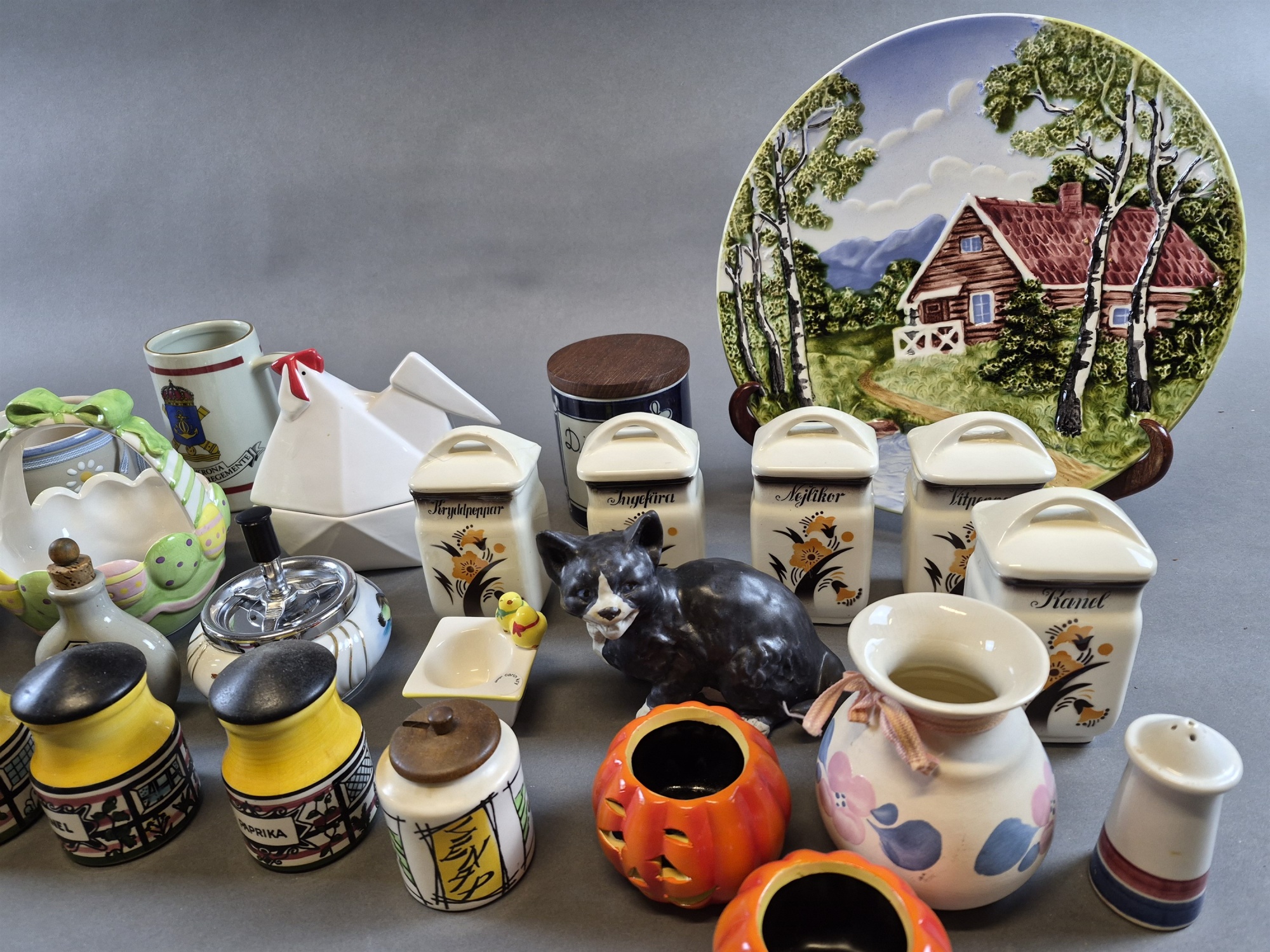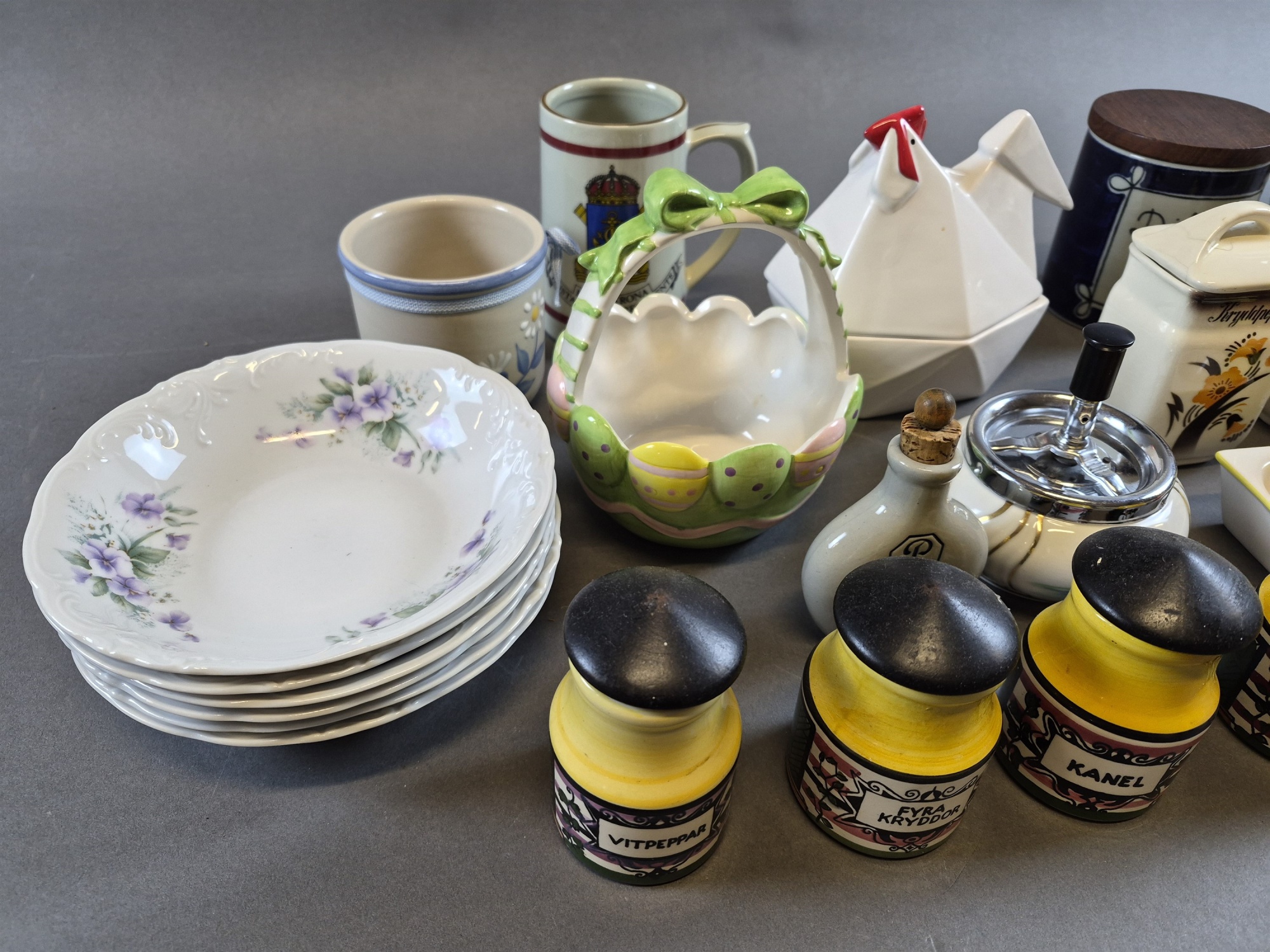 Parti keramik bl.a kryddburkar, dekorationsfat diameter 31 cm