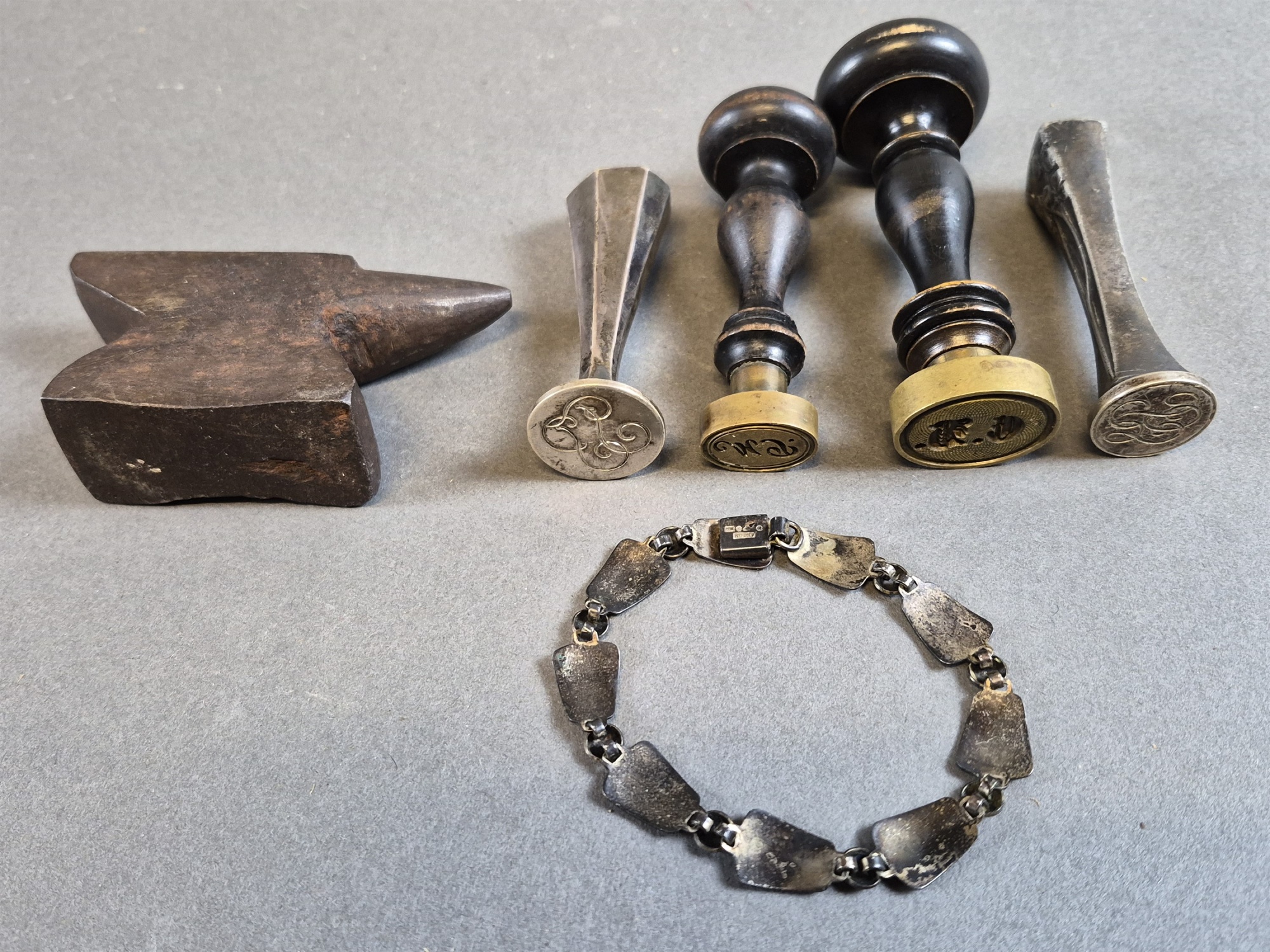 Sigillstamps 4 st en silver, silverarmband & smyckesstäd järn, totalvikt silver 32 gram, högsta 9 cm