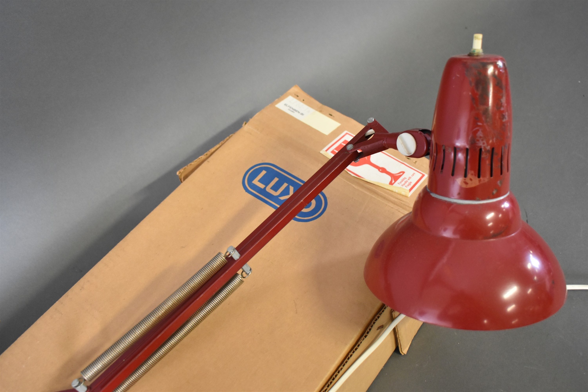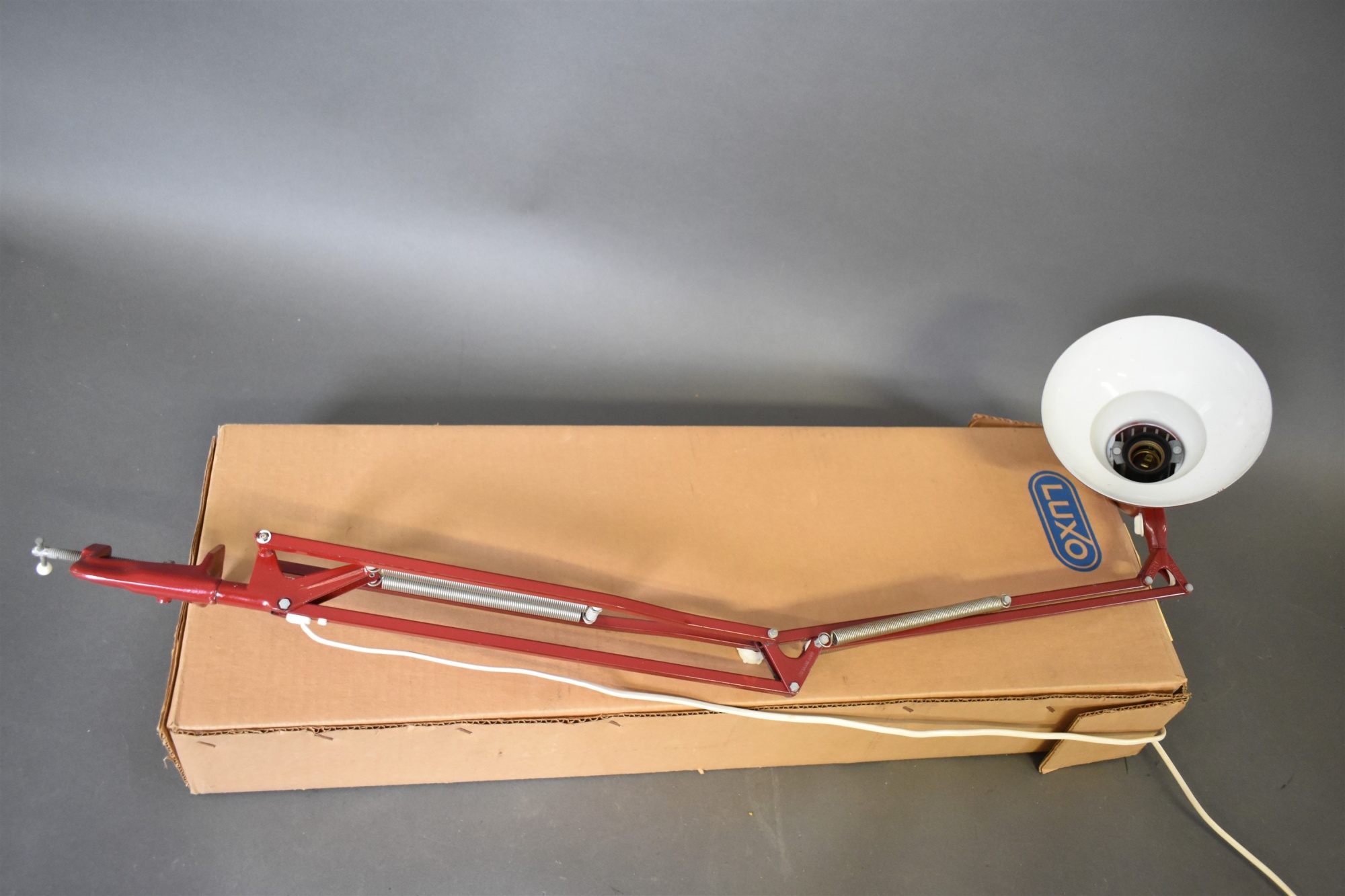 Skrivbordslampa, Luxo, i originalkartong, längd låda 79 cm